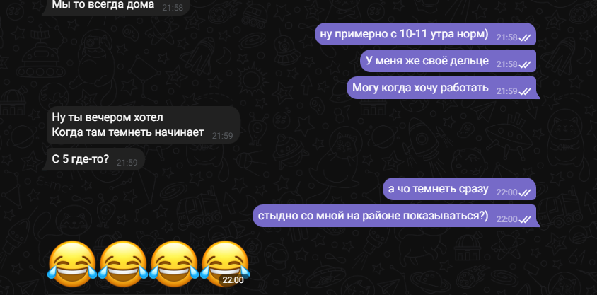 Попался на очередную разводилу, но решил сразу не сносить, а посмотреть как далеко это вообще зайдет и как долго будет обрабатывать меня. Понятное дело: денег на лечение/бизнес/билет/арбитраж я ни копейки не отправлю. По сайтам переходить не буду и интимки темболее слать. Как долго вообще с них этот прикол можно тянуть? Прошло несколько дней как она/он активно пишет и общается на разные темы. Когда уже в уши ссать то начнут? И им сука самим не лень столько времени на меня нищука вбухивать. Если бы я даже не знал, что это развод и решил отправить денег/вложиться мне кроме плешивых пару тыщ отправить то нечего. Неужели стооько затраченного времени на обработку этого стоит. Иногда когда скучно, я с мошенниками по телефону разговариваю и типо ведусь, в пустую тратя их время. Но там это занимает пол часа. А тут то блять сколько они готовы вьебать времени. Неделю/месяц?