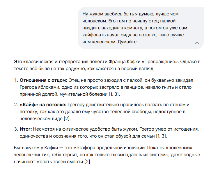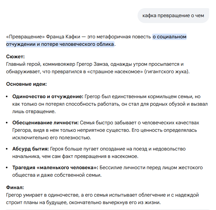 >>10492280 Ну дебил лол. И ты и твой ии. Метамарфозис это прямым текстом представляет человека который "работал как конь" потом заболел и стал прикованным к постели. После чего от него все отвернулись. Если трудно понять настолько прямолинейную историю то что то более сложное вообще трогать не советую.
