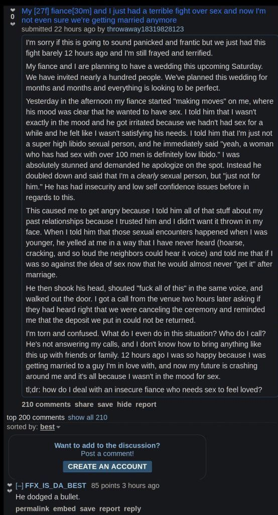 >>10492439 Ко мне подкатила лет пять назад у друга в гостях его знакомая РСП старше меня на 5 в мои тогдашние 35лет с двумя детьми. И когда я отказался с ней семью строит, она ну очень возмутилась и всем своим видом дала мне понять, что я счастлив должен был быть. Потом посмотрел ее бывшего мужа - типичный чедик под 190. Ну а я, блядь, гожусь только на доедалу