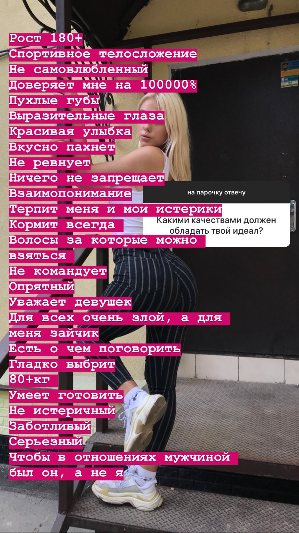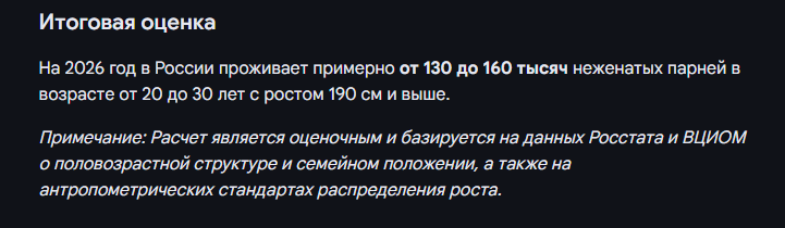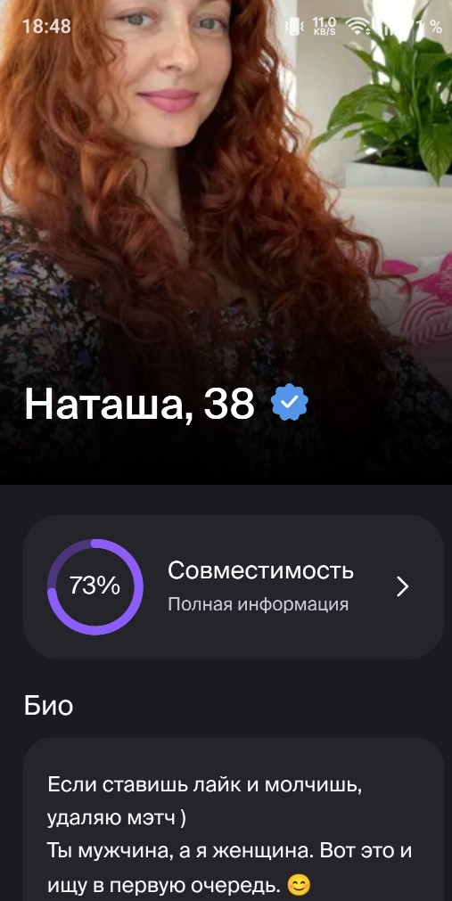 Решил создать анкету в дв не со своими возрастом (указал 35 лвл) и вот что заметил До 30 лет симпатичных девушек много 30-35 уже меньше но еще можно найти 35+ где то 8/10 анкет это жирухи, в этом возрасте найти красивую задача со звездочкой. Про рост только пара анкет была, там указывали что им нужен парень с ростом не ниже 170-175, одна была где минималка 180 и одна где женщина искала 190+ но она сама была ростом 186, т.е росто шиза это реально шиза разогнанная зумерами на основе тт рилсов созданные для подрыва жопы чтобы в топы залетать, ирл всем похуй на ваш рост если вы хотя бы выше 170, 175+ уже хорошо 180+ отлично, но никто не начнет вам харкать в ебало если узнают что вы 172.