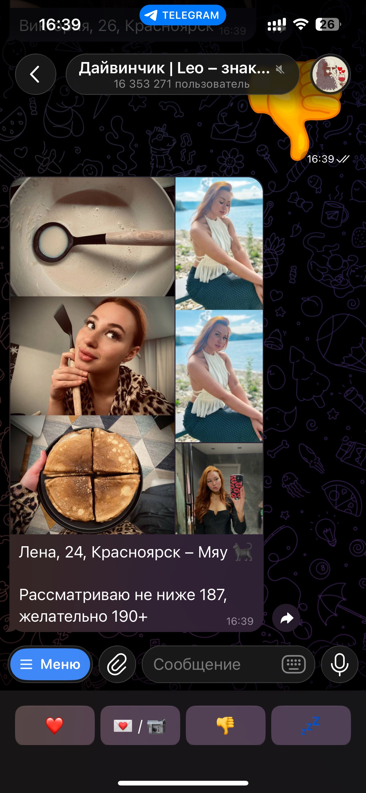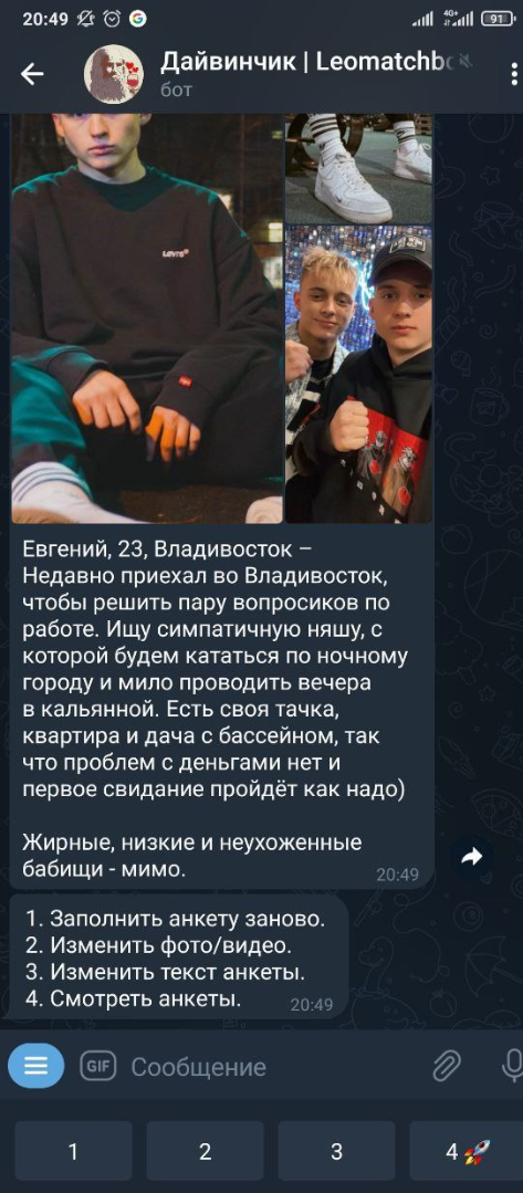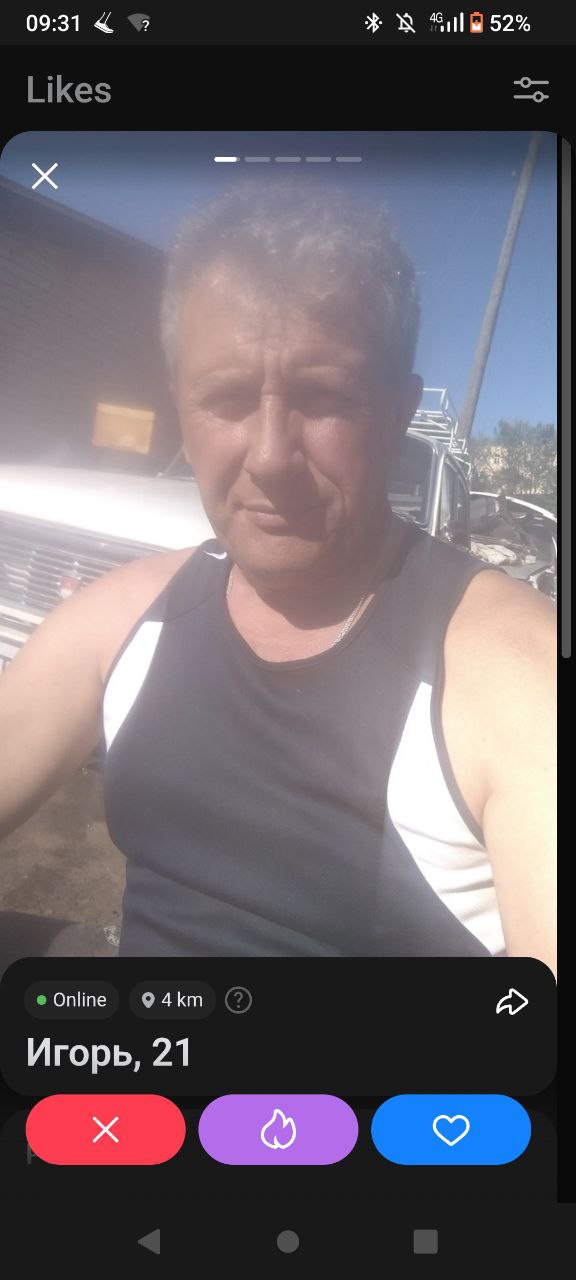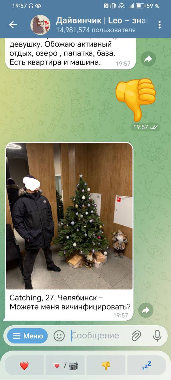 Ну что, попробовал вчера вечером я ваш дайвинчик. Захожу сегодня и что вижу во взаимных: 8 жирух, 2 рсп, 1 просто всратая лицом. Спросите зачем лайкал? Отвечу фото в анкете и фото и сторис в профиле тг отличаются. Это реально дно какое-то.
