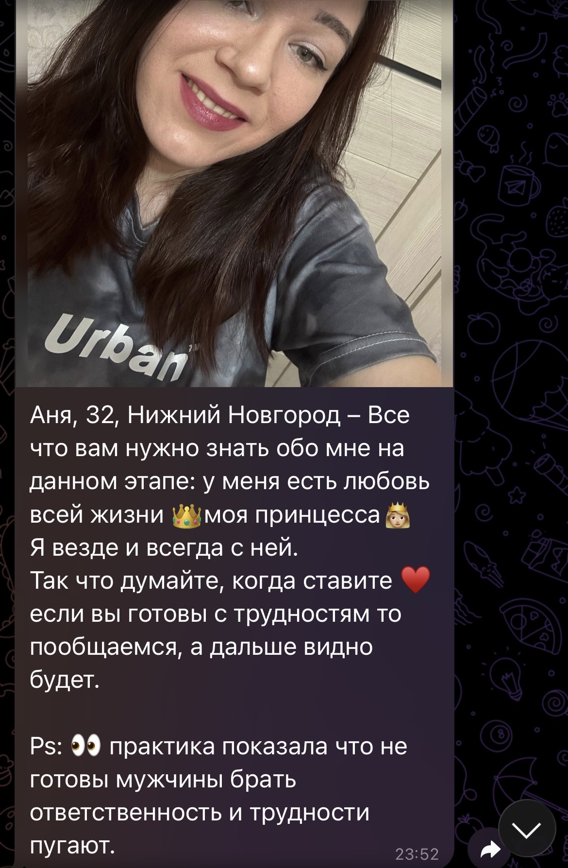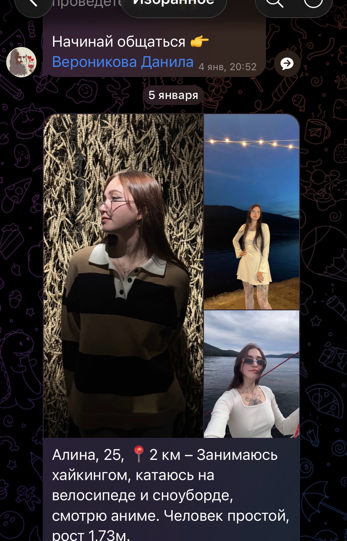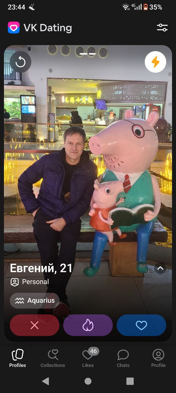 Ну что, попробовал вчера вечером я ваш дайвинчик. Захожу сегодня и что вижу во взаимных: 8 жирух, 2 рсп, 1 просто всратая лицом. Спросите зачем лайкал? Отвечу фото в анкете и фото и сторис в профиле тг отличаются. Это реально дно какое-то.