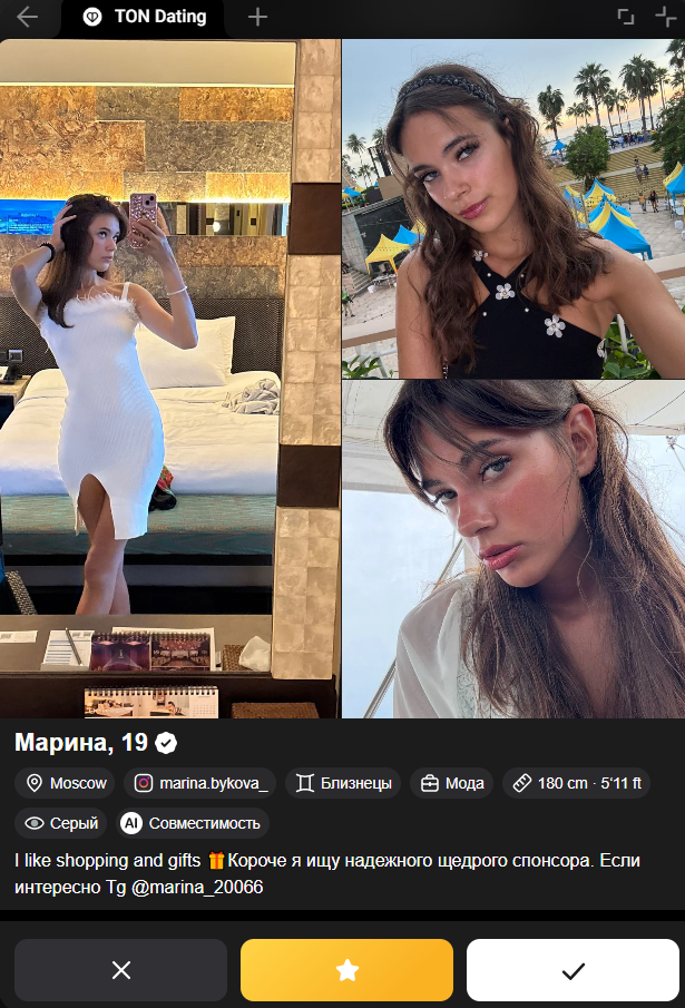 За 2 суток набрал 25 мэтчей в твинби с премиумом. Из них удалось выцепить в тг только троих, локация дс-2. Завтра будет свидания с одной, вторая была готов на завтра, но завтра уже занято первой, в другие дни не сможет, походу слив будет. Третья как-то не симпатичная, даже неохота звать. Кста первая тян по нации таджичка 100%, родилась тут. Выглядит неплохо, есть фотки в купальнике и судя по каналу может выпить. Оч странно, я думал все таджички закутанные ходят. Немного стремаюсь что меня отпиздят точики на месте встречи