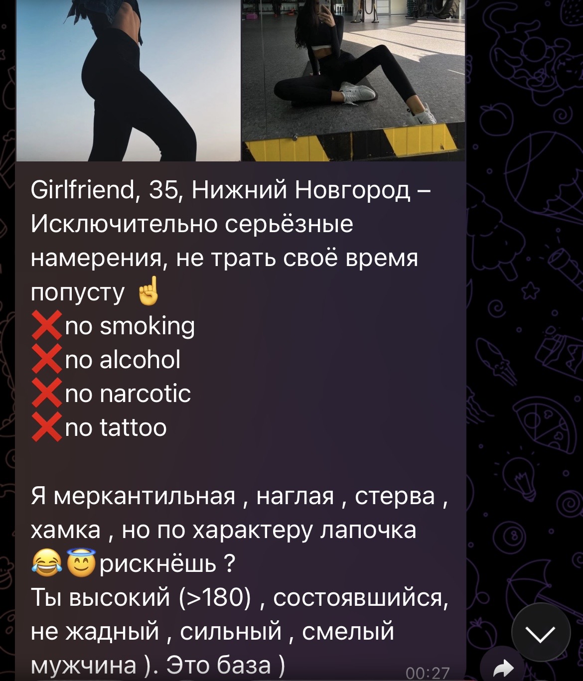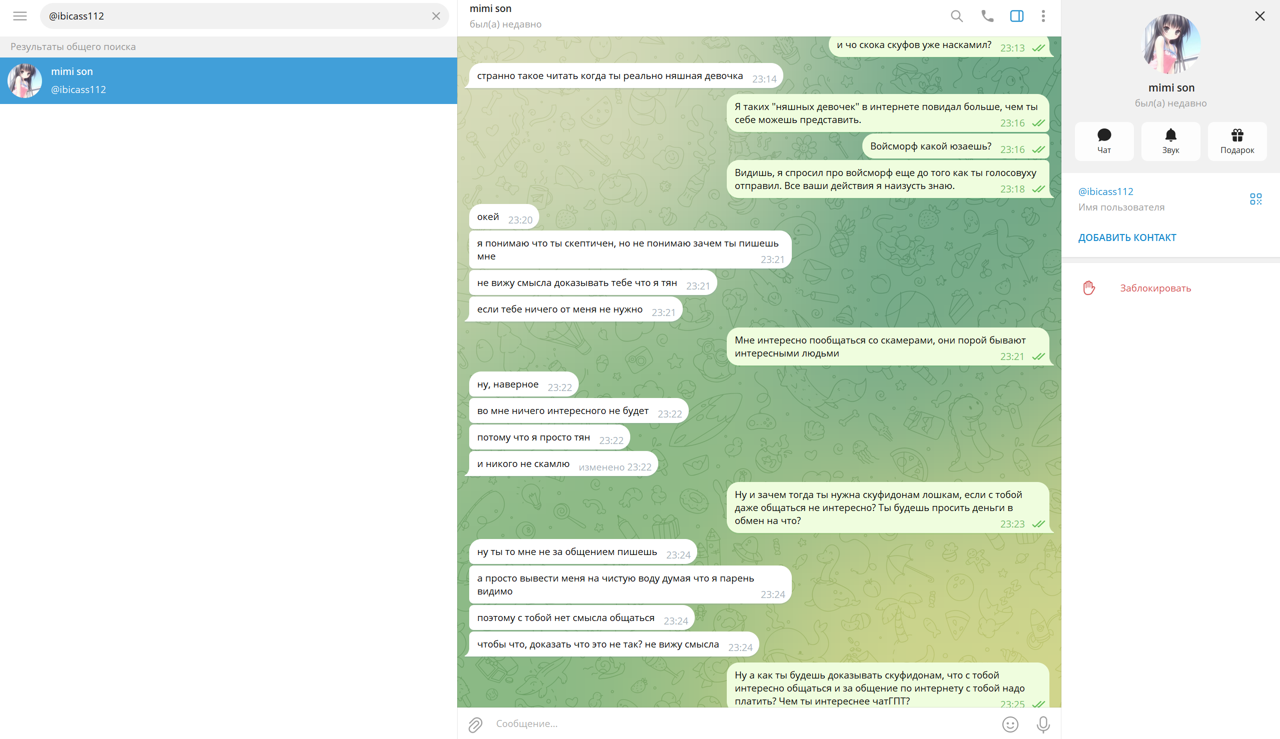 Посидел потыкался с гроком, похоже реальная имба, завтра досрочно прерываю отдых от свайпанья тухлодырок. Сделаю пару фоток на кухне при дневном свете, попрошу нарисовать что-то блатное на фон. Думаю 99% тухлодырок не заподозрит подвоха, особенно на фоне их ебаных фоток с миллионом говнофильтров.