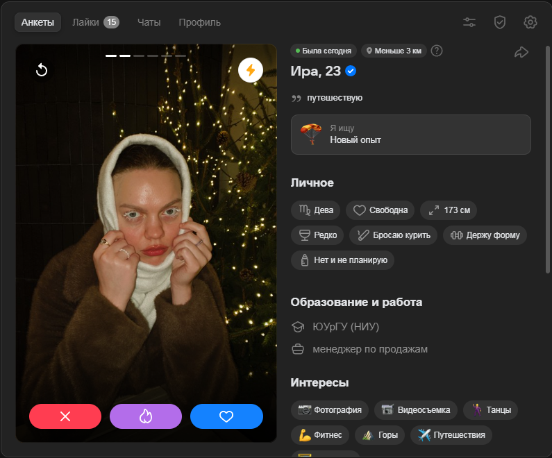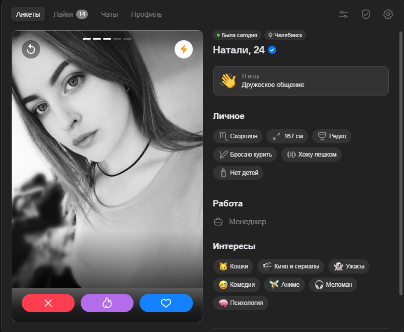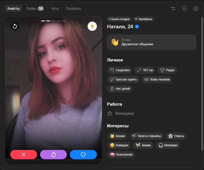 Господа познакомиксы, что я делать не так. ДС, анкета на дайвинчике вообще не собирает мэтчей, то есть ВООБЩЕ. Ещё веду пьюр и ВК зарегал на пару вечеров, в первом когда сижу 3-4 мэтча в день, в ВК за два вечера 3 мэтча было. Состав анкет идентичен, ну прямо один в один. Лайки ставлю всем подряд, критерии поиска одинаковые.