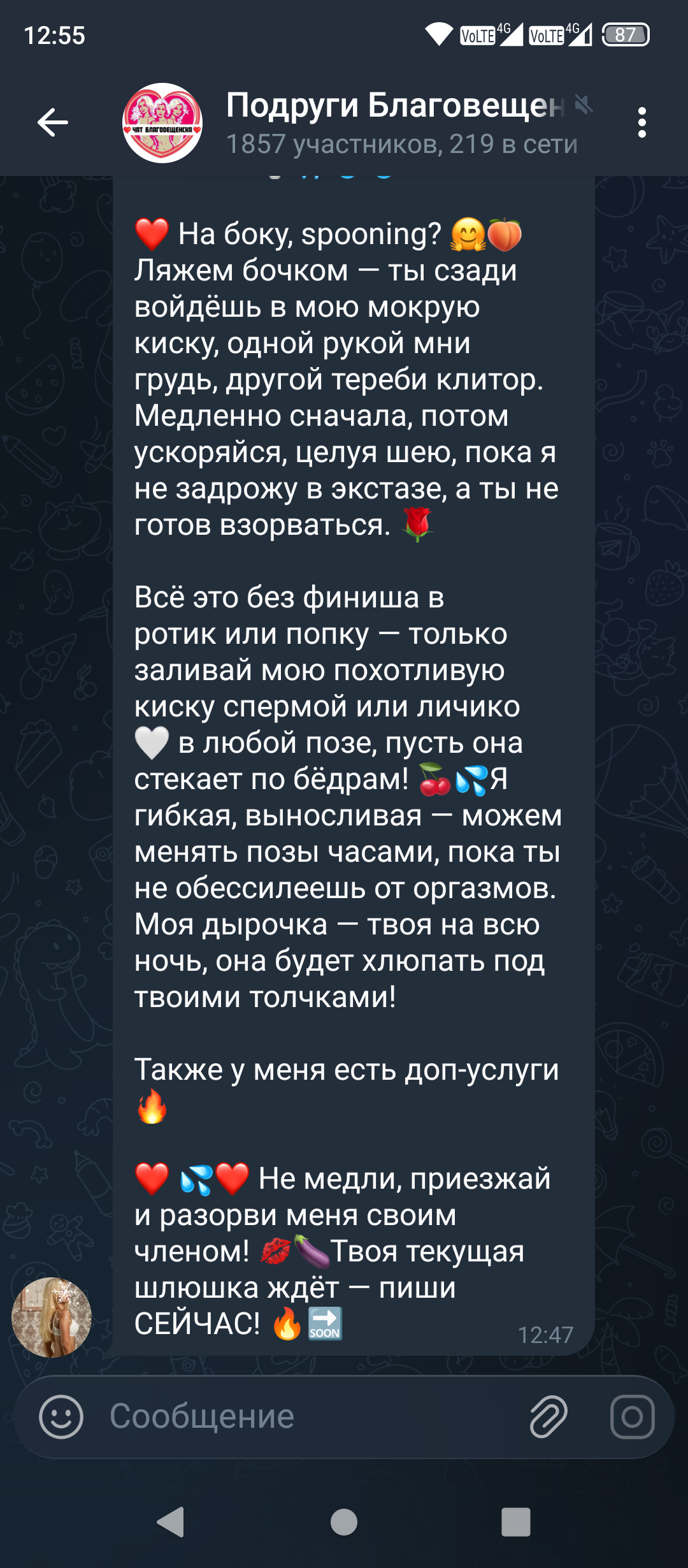 Сап. Потерял одну фею, уже больше месяца не видел еë анкеты, может знает кто, выкатилась она или нет. Тити были 4 размер или больше даже, 26-27 лет, было два никнейма: "сочная пышка", потом стала Milk Girl. Такая chubby девчëнка. На Таганской работала, потом на пролетарскую переехала. Отзовитесь, кто про неë что-то знает, очень хочу повторить поход