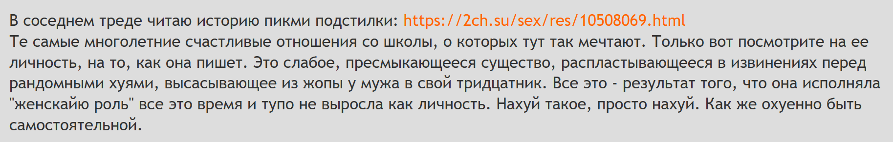 Про остальное твоё, скажу, что у меня из-за ебаных борд действительно в детстве была проблема с мизогинией внутренней. Борды из-за контингента почти исключительно мужского своими историями о плохих женщинах мне так насрали в мою детскую голову, что мне было стыдно быть девочкой, я писала о себе в мужском роде не только на бордах, но и в школе, даже в обычной речи тоже, про шлюх писала, да (простите), и у меня была эта хуйня, что мне прямо очень хотелось показать (непонятно кому), вот смотрите, я не такая, как они, пожалуйста, видите, не все тян плохие. Вот эта вот вся хуйня. У меня даже где-то были мысли начать знакомиться с тогдашними двачерами (которые в лучшем +3-4 лет от моего тогдашнего возраста), чтобы им помочь не разувериться в девушках. Пиздец, как же хорошо, что у меня просто решимости не хватило тогда из-за опасений в том, что меня просто убьют нахуй. Сейчас понимаю, в любом случае даже если бы и не убили, то мне психику бы выели точно. И у меня всё вот это отношение, как и вот этот позавчерашний приступ с просьбами не относиться плохо и понять, это следствие начала сидения на бордах в столь юном возрасте. У меня это совсем выкинуть вряд ли выйдет, что поделать. Хотя в чём-то они правы. Мы, как я и говорила, все больные тут, и все друг друга, и себя ненавидим. Но муж же никогда ни единого повода (даже в наши ссоры эти он ничего не говорил на эту тему) не давал к подобному, и он наоборот своей поддержкой мне помог справиться с этой болезнью. Мы с ним даже отдельно эту тему проговаривали. Через Жанну Д'арк, лол. Я уже через год не вспоминала почти о всей той хуйне, что меня до того просто в мозг вгрызалась. Так что ты хуйню про него пишешь.