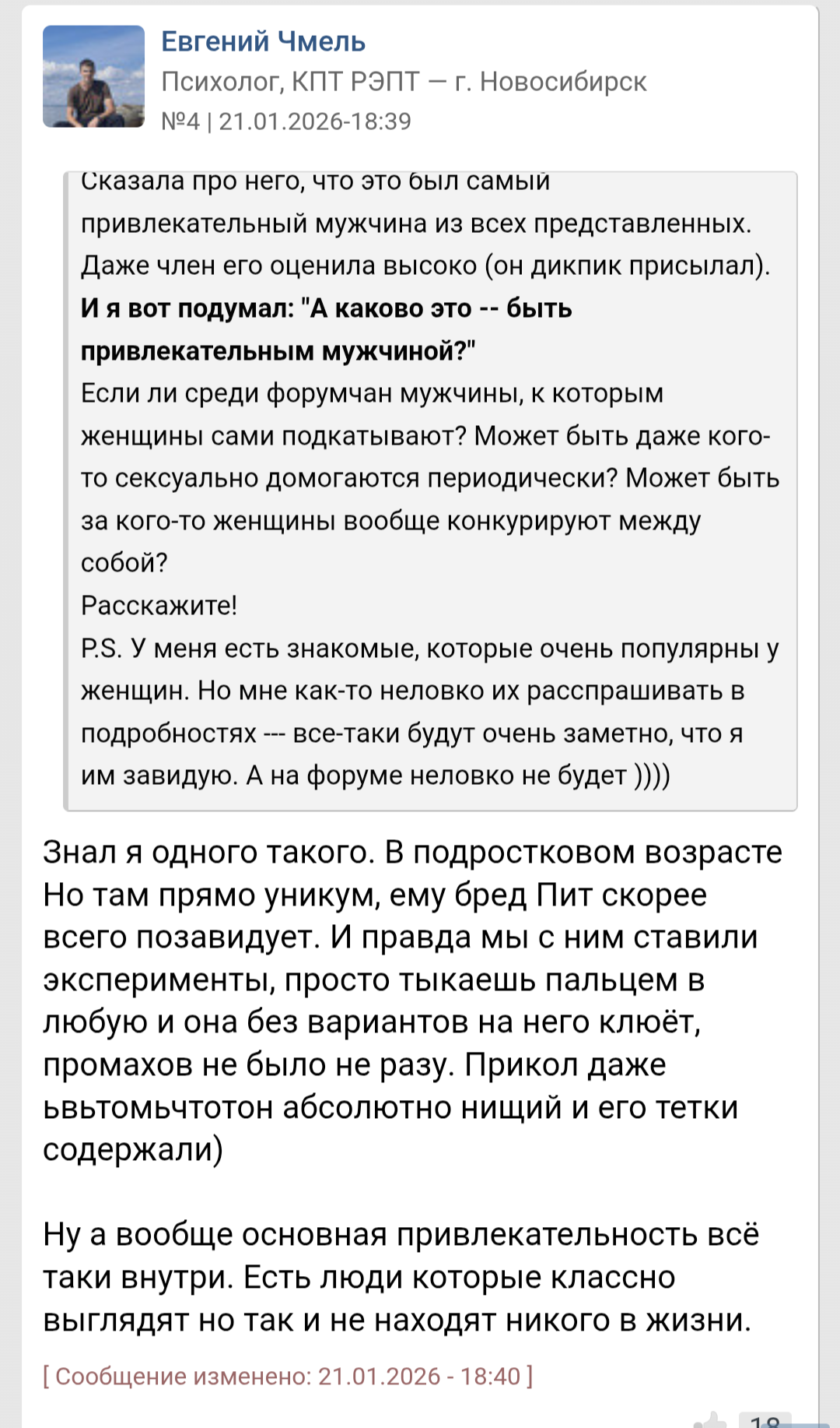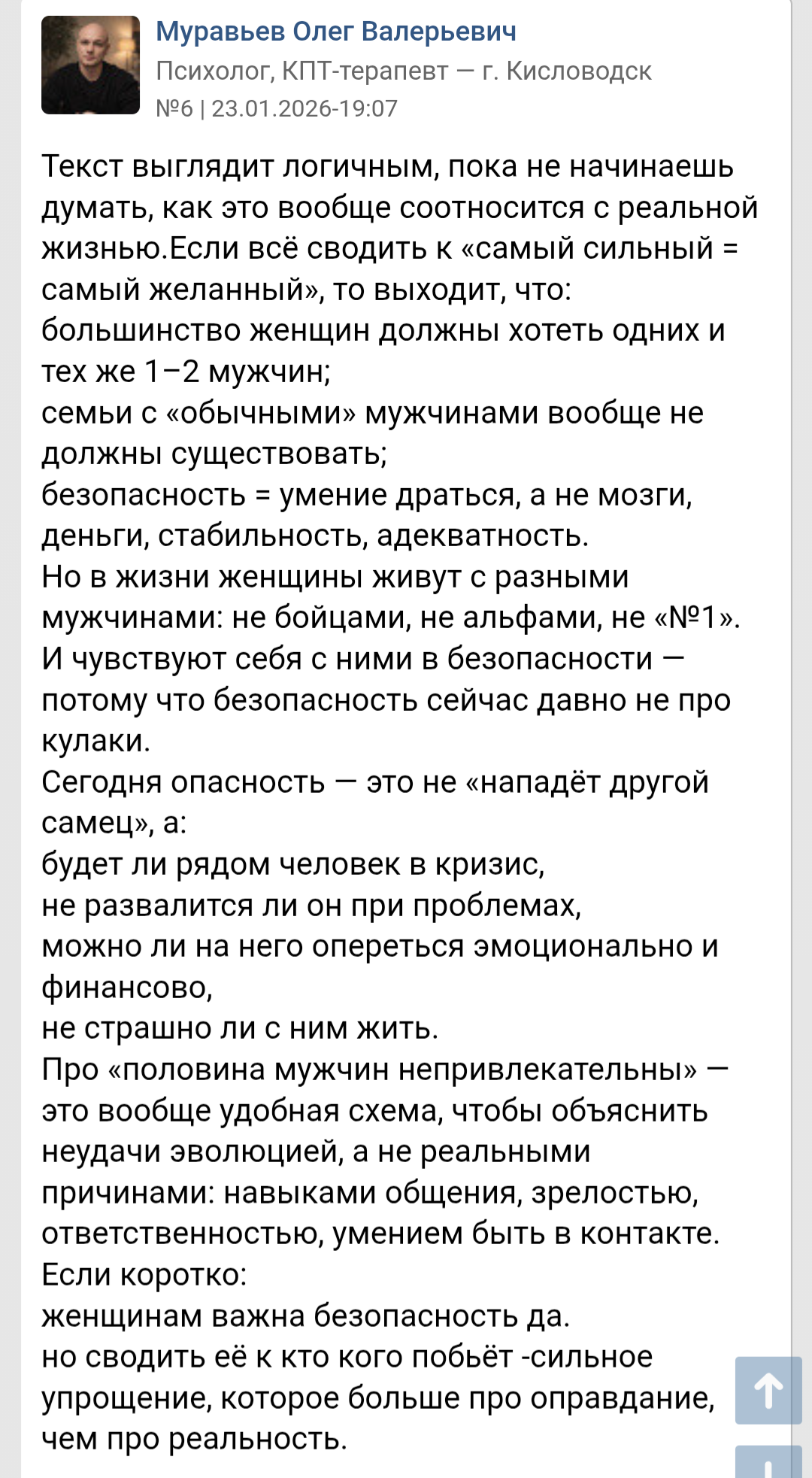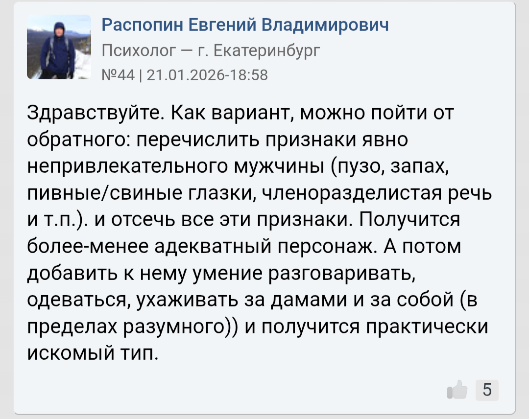 >Про «половина мужчин непривлекательны» — это вообще удобная схема, чтобы объяснить неудачи эволюцией, а не реальными причинами: навыками общения, зрелостью, ответственностью, умением быть в контакте