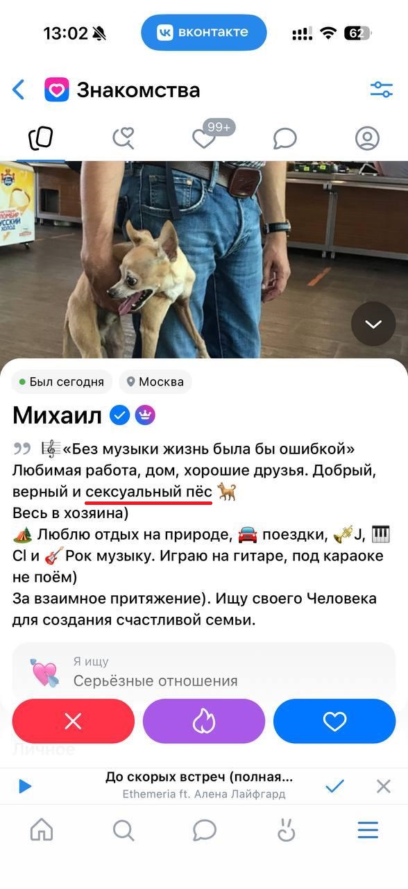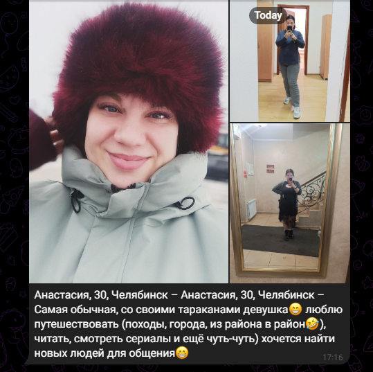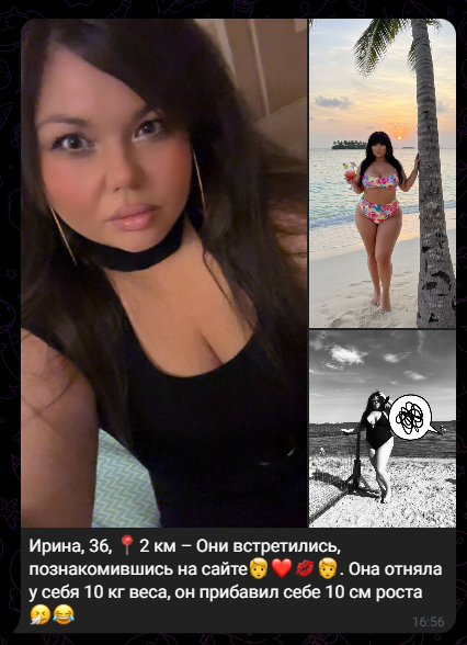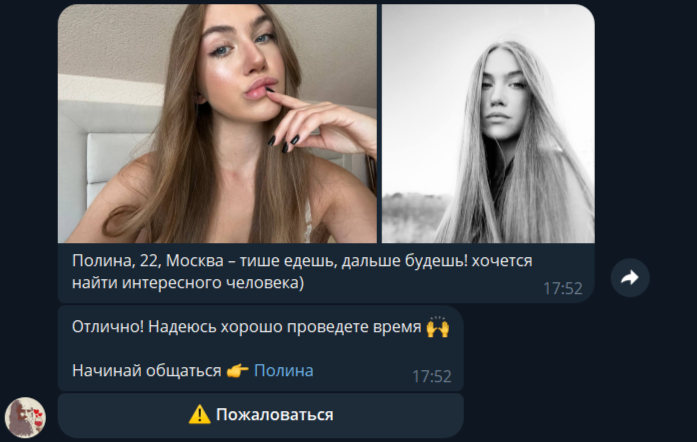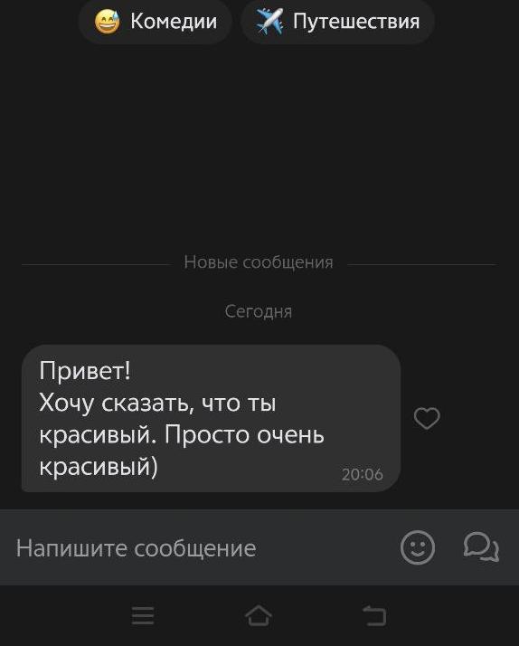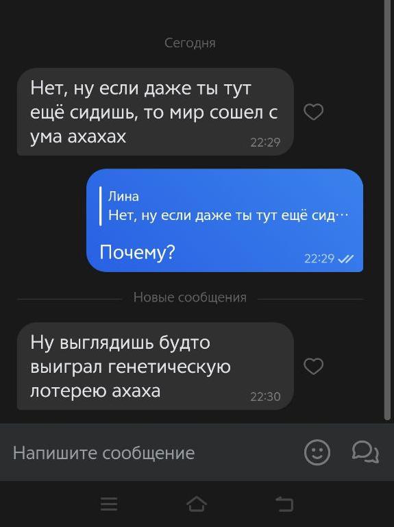 Три раза ходил на свиданки за последний квартал, тянки писали в тот же вечер, мол, спасибо шо пригласил, добавляйся в тг ко мне (кстати, я в ахуе, когда сидел на дейтингах 4-5 лет назад, такое невозможно было представить). Но с этими тянками не складывалось по моей вине, я пиздострадал по бывшей и сам дропал общение.