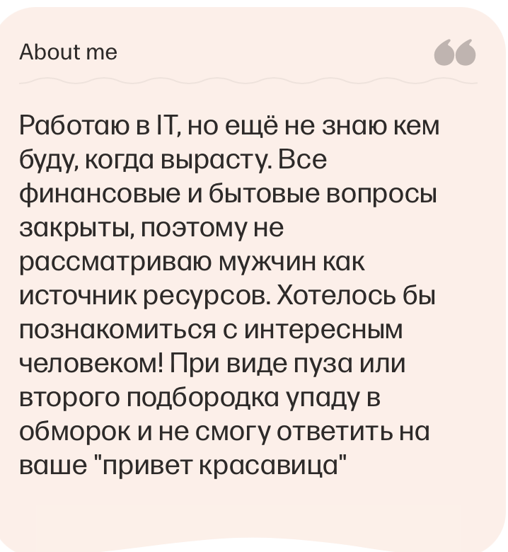 Ох, как же потужно. Все антипаттерны онлайн знакомств, которые сами же бабы и объясняют причиной отсутствия интереса к мужику. И это на все, что они способны? Мы живем в каком-то противоречивом и двуличном обществе.