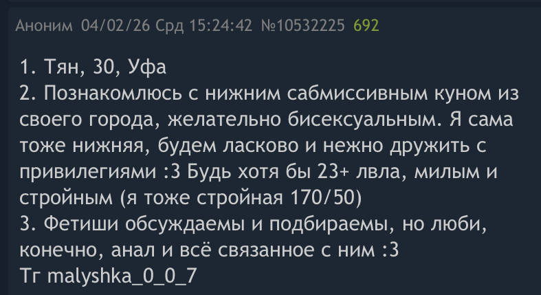 >Тян с сз поумолчанию общается с кучей народу Хорошо, расскажу, как у нас с ней завязался диалог на сз: я писал ей несколько раз, она ответила только первый, потом читала и игнорила, при этом не заходила неделями между этим, но я почему-то решил, что она стоящая и решил проявить настойчивость, тактично попросил у нее тг и там уже пошло-поехало. После этого она точно так же редко заходила и сидела там по ощущениям минут 5, то есть за это время особо не попереписываешься. Все возможно конечно, но вероятность того, что она все это время общается только со мной довольно не маленькая.