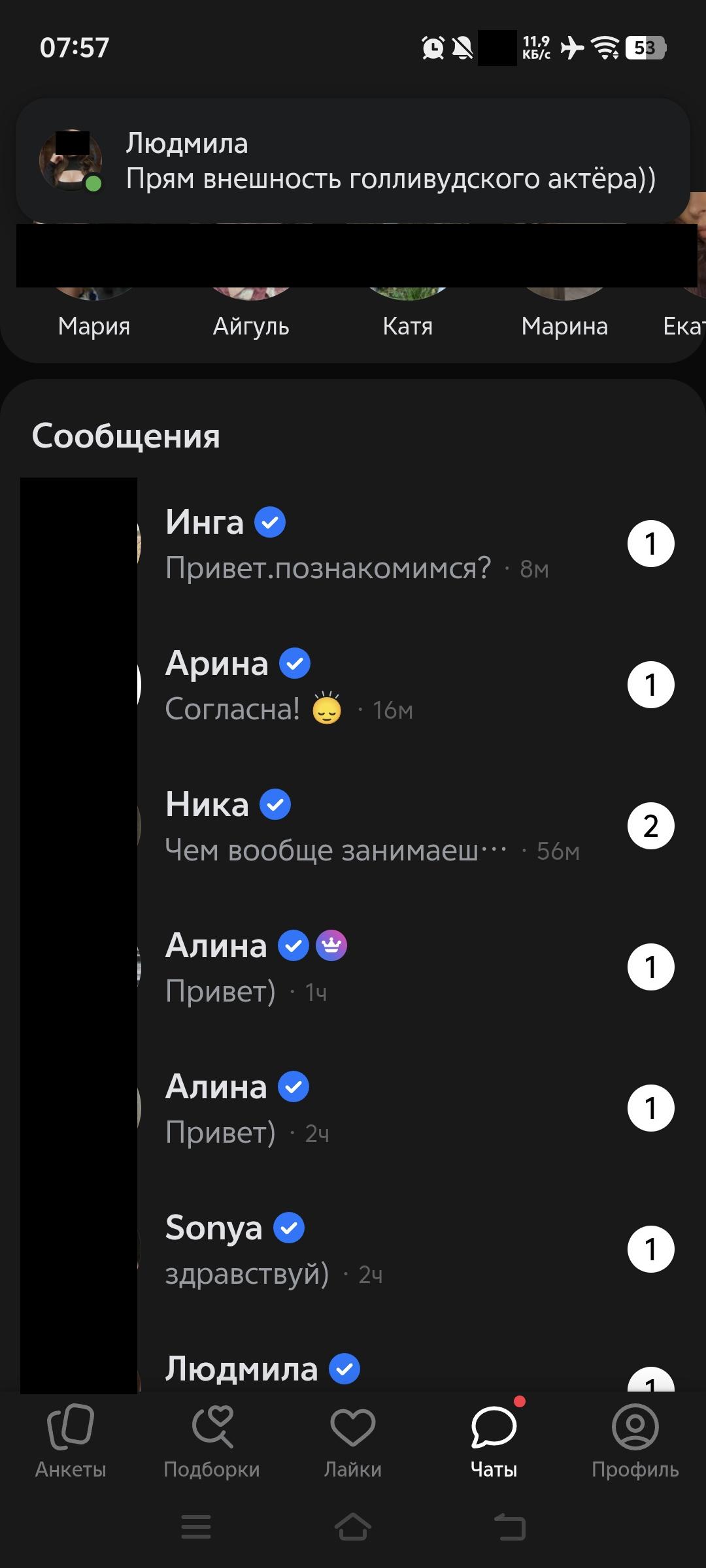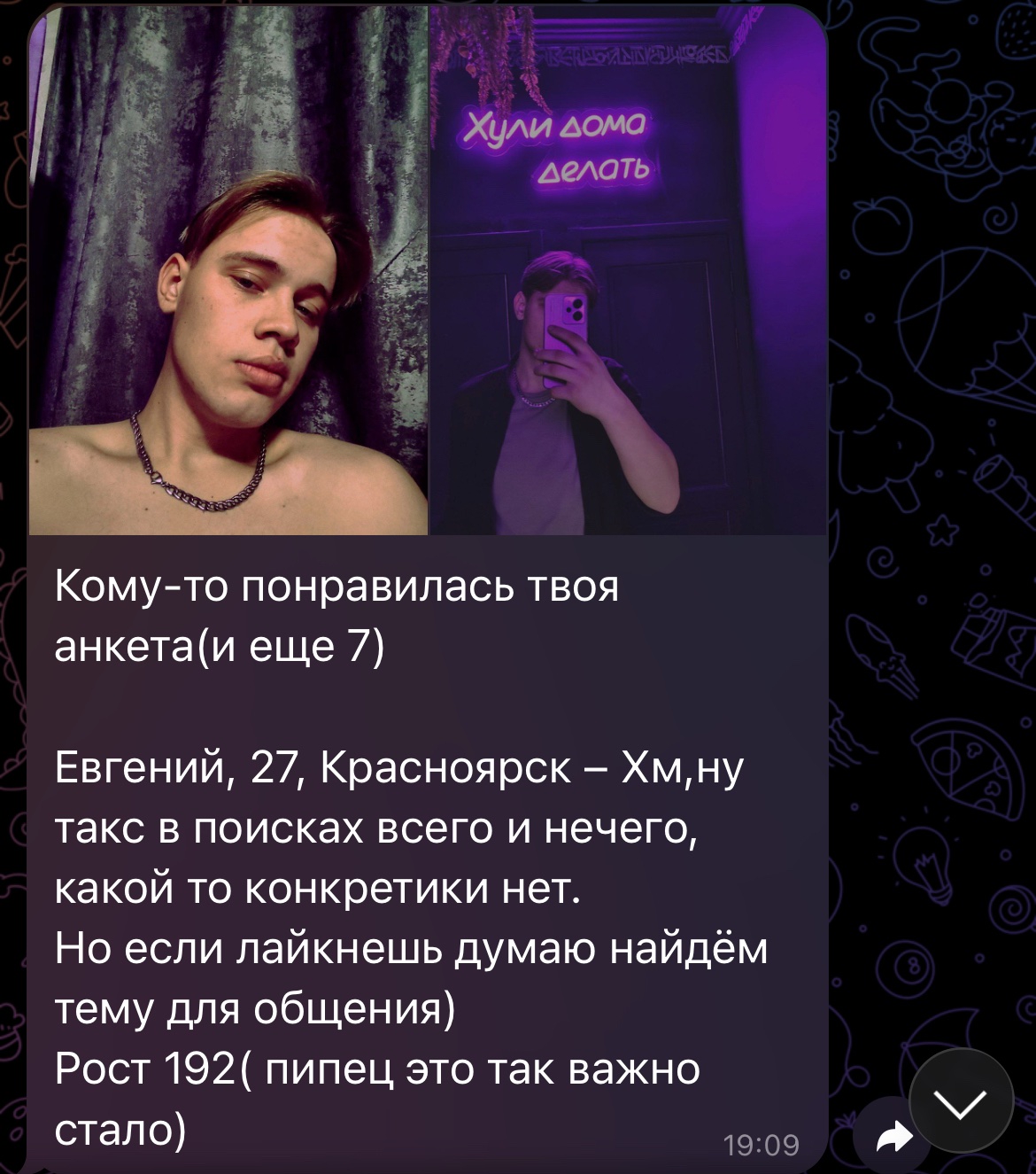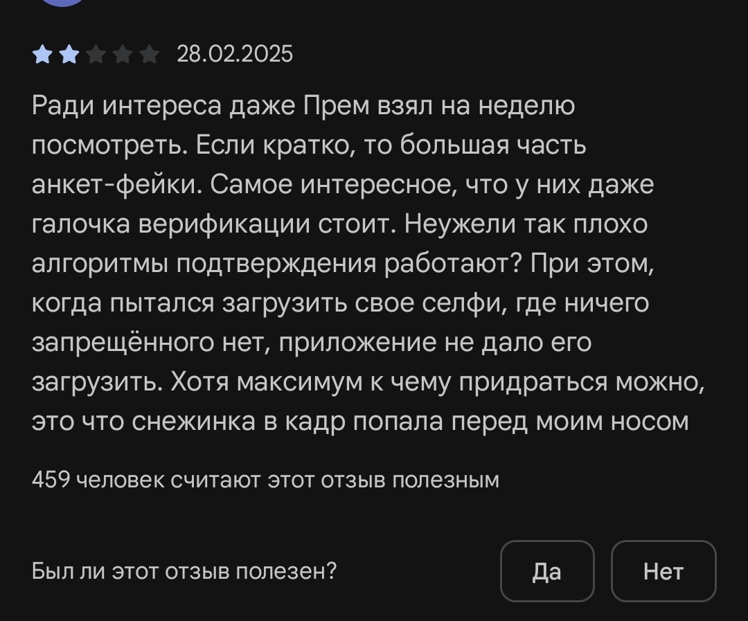 У меня за ночь еще 30 прилетело. Суммарно где-то 80 за первый день, но толку от этих лайков, если большинство от среднетян 25-30 (я рассматриваю 18-21), которые «хотят влюбиться». По анкетам сразу видно, что писать нет смысла, с головой проблемы у многих