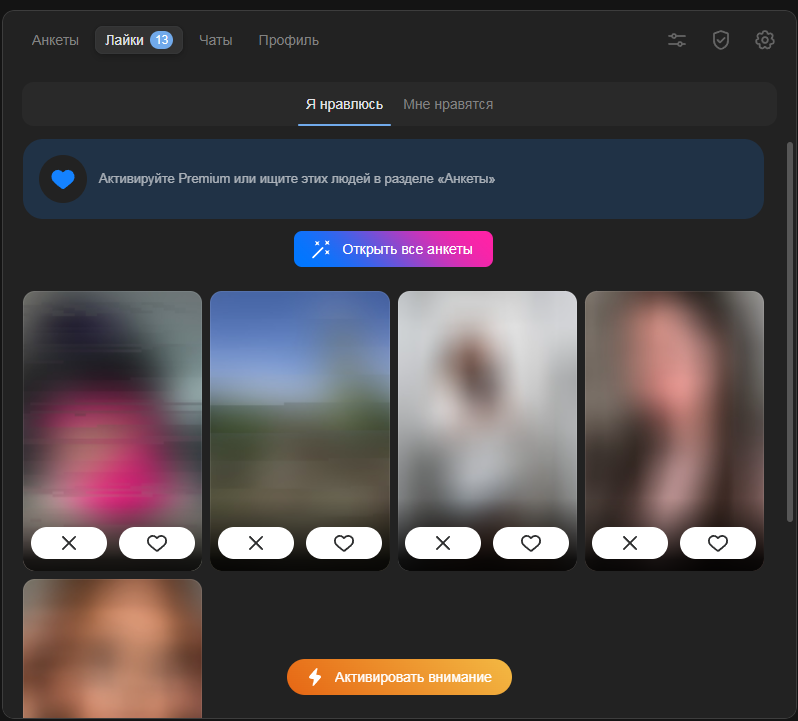 >>10532988 У тебя куплен премиум? Без него делать нечего на сз. Если да, то что-то у тебя с анкетой и фотками не то, скинь в тред, подскажем