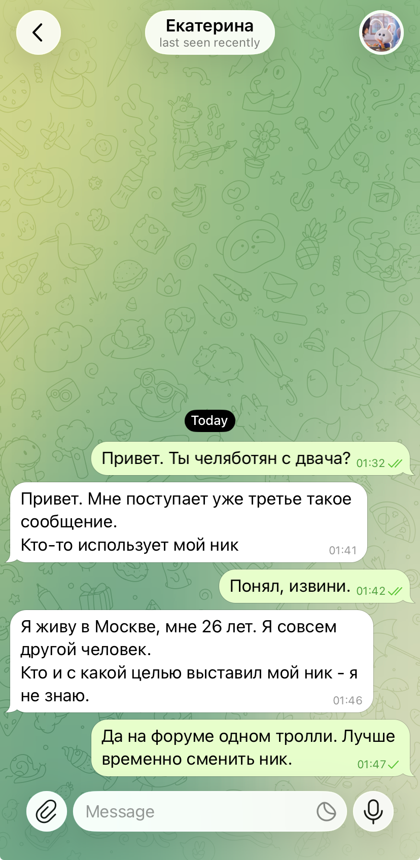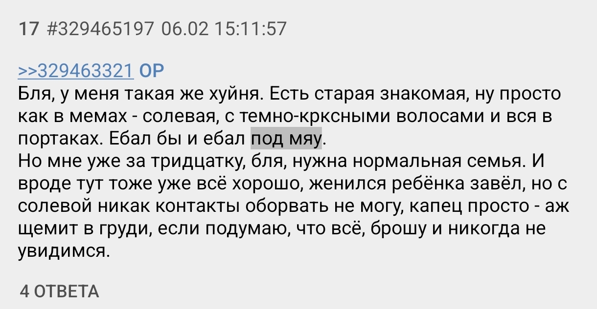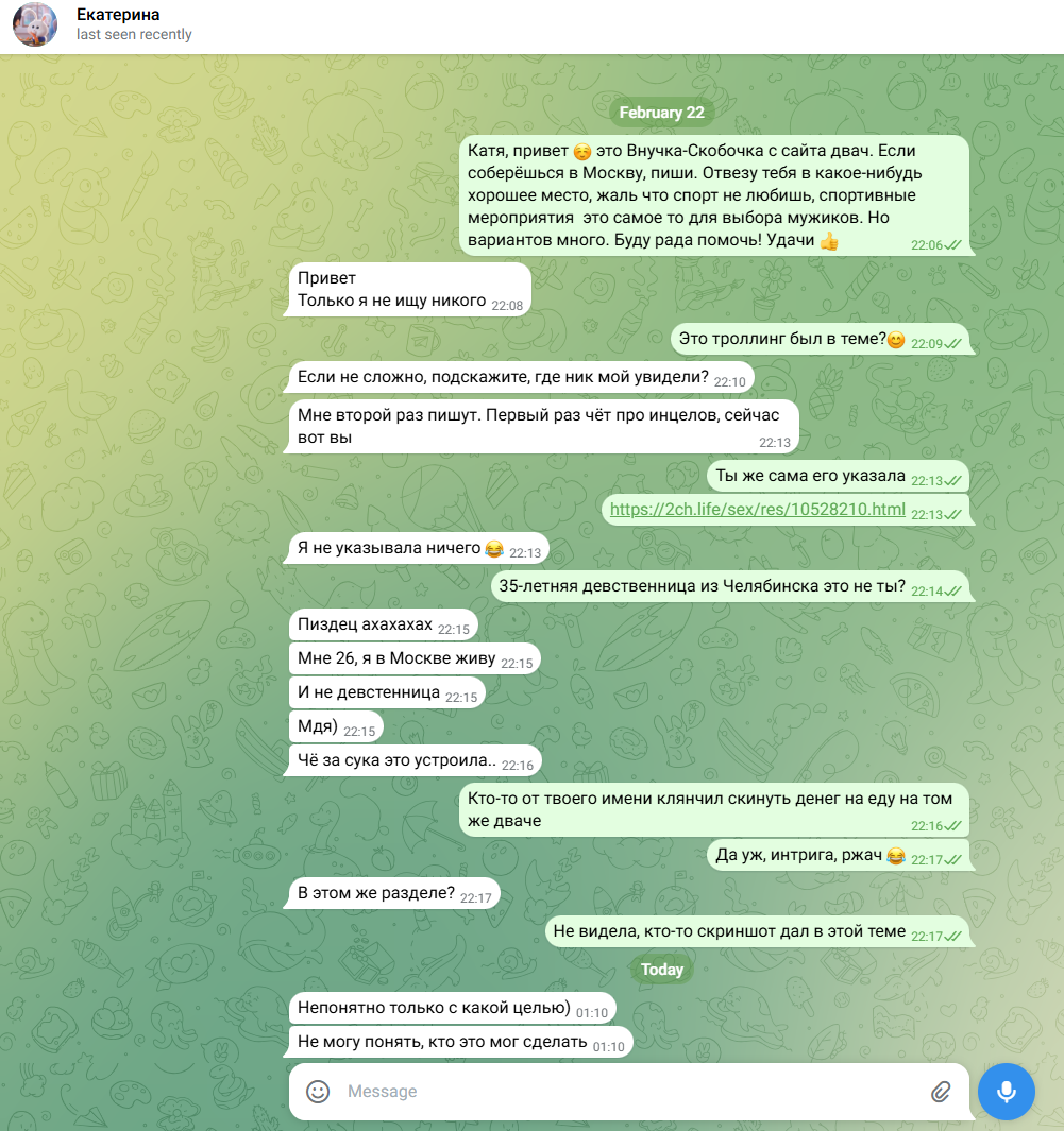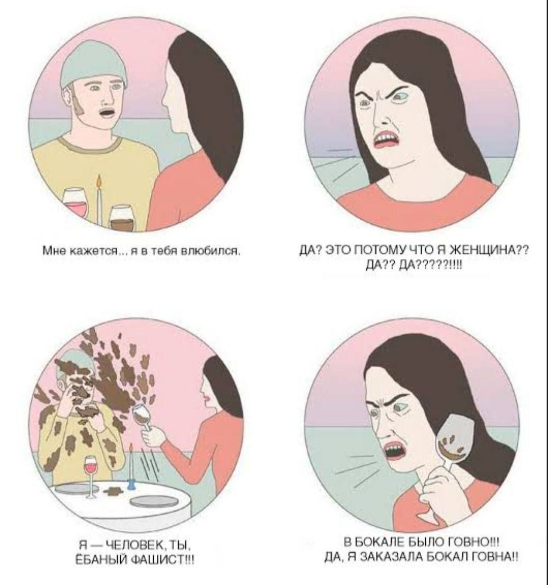 Таких очень много попадалось до конца десятых, опыт общения с ними у меня большой. Сейчас стало сильно меньше, в основном они теперь в Грузии-Армении-Израиле. Но вот буквально в декабре смэтчился с подобной в пьюре, пошутил на тему пересекающегося кинка (больше зацепиться было не за что, в описании анкеты хуйня) и в ответ получил кучу мелкобуквенной агрессии, сводящейся к "мне такое хуемрази пишут по тысяче раз на дню". Я ради интереса развивал диалог, пытаясь вывести на причину тряски, но после пары десятков сообщений в обе стороны отправился в бан.