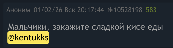 Ого, как интересно)) Интересно, заказал ли кто-нибудь из "мальчиков" еды сладкой кисе? Сладкая киса решила попробовать поклянчить на дваче, может к чему и приведёт))