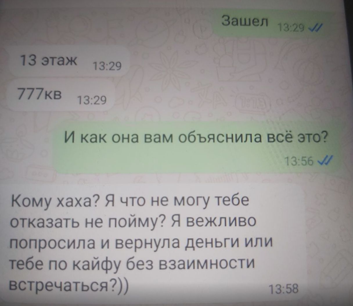 >>10537403 Пчел, я пишу по той инфе, которую написали. Деталей всего вашего разговора я не знаю.