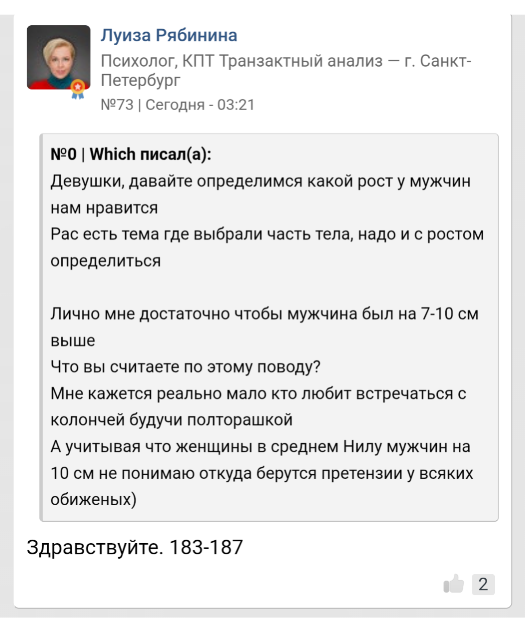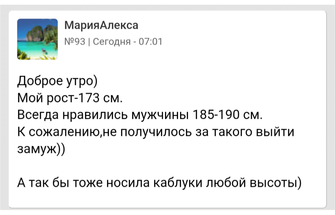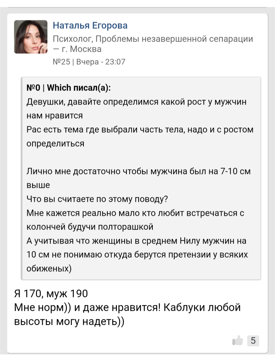Я 187 босиком в середине дня. Хоть большинство тянок ниже моего подбородка, я все равно ощущаю себя маленьким. Поэтому ношу 2,3 см стельки, и стараюсь максимально вытягиваться. Карлики-троляки добились своего