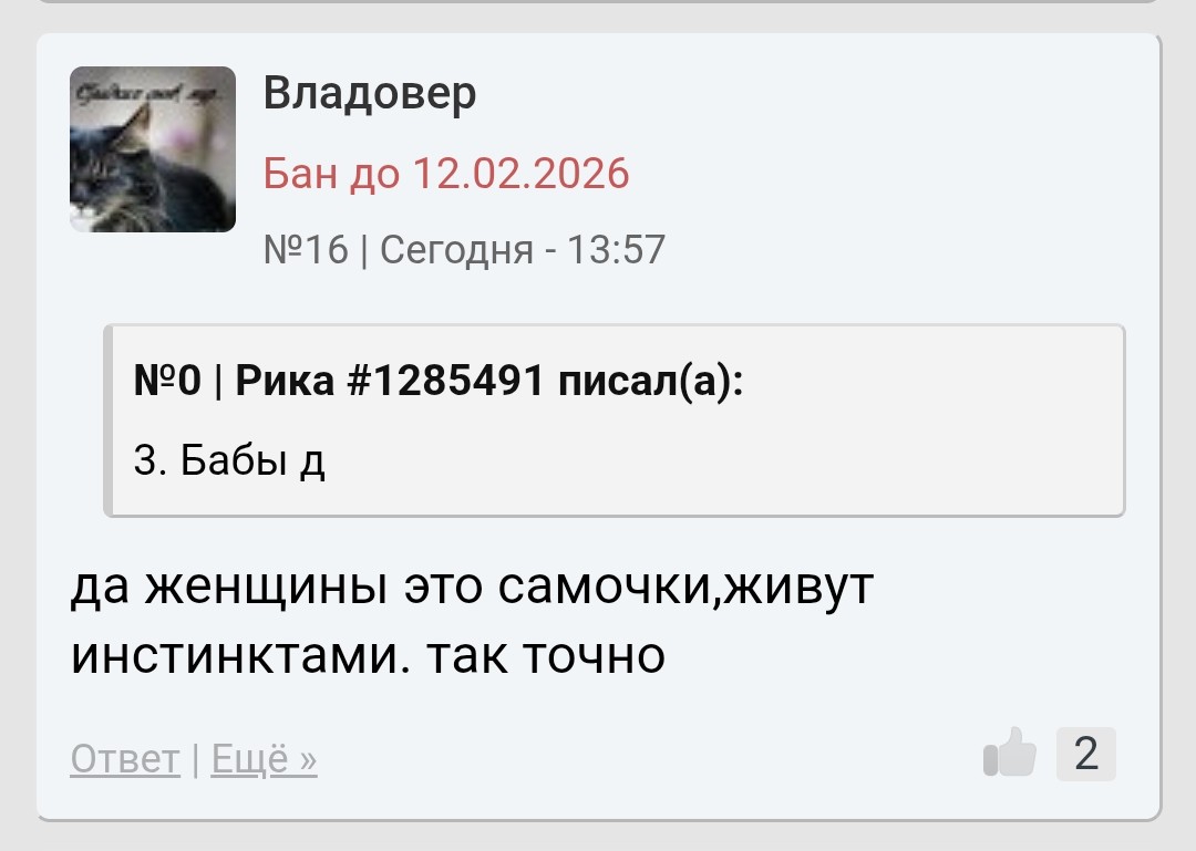 3. Единственный пункт с которым соглашусь (не без смеха за кулисами). Когда женщина влюбляется, она сама не своя. Однако. Если же говорить в целом, то среди женщин не мало учёных, профессоров, докторов и представителей самых разных профессий. Причём такие женщины были и раньше, просто в меньших количествах. Достаточно вспомнить ту же Кюри или даже Жанну Дарк. Откуда же стереотип о женском интеллекте? Думаю тут имеет место три причины (может, больше, поправьте меня, если что). 1) всё теже проекции. То есть если мужчине нравится женщина, он ведёт себя глупо, вплоть до огромных трат денег, ревности, драк и прочего. 2) у женщин есть цикл. И в зависимости от времени цикла зависит гормональный фон, а значит и настроение и общее состояние организма. То есть в крайних полюсах женщина уверена в себе - женщина плачет и страдает. И да, у разных женщин это проявляется по разному. У кого-то почти незаметные колебания. Но стереотип укоренился. 3) глупые и истеричные женщины на ютубе, тиктоке и т.д. так или иначе дураки есть среди всех полов, ровно как и умные.