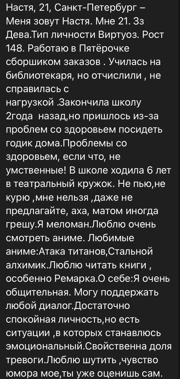 раньше жил с тульпой в голове и придумал кулстори про умершую девушку которую очень любил и то ради того чтобы распускать сопли и отказывать нормискам тк они слабые и тупые