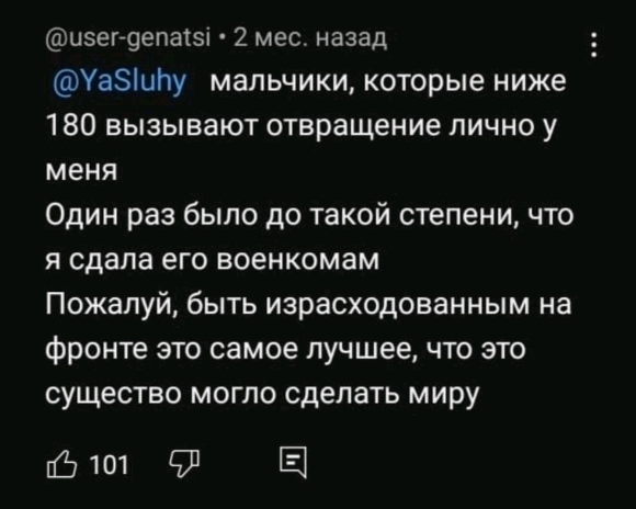 Я вот думаю послужной список вести, записывать туда самый такой биомусор, который меня отшил. Там пока что аутистка, которая училась в школе для умственно-отсталых, у которой гормональное расстройство и усы, и жирная фемцелка феменистка.