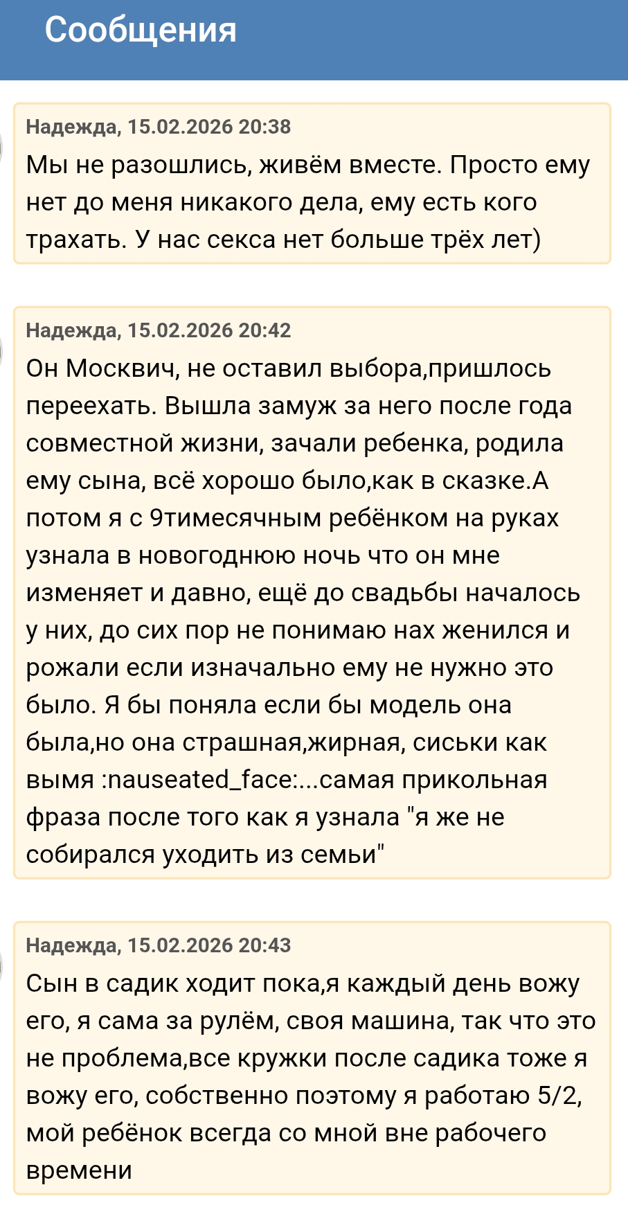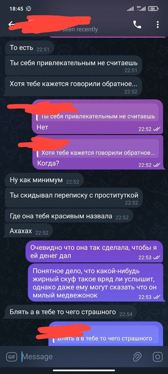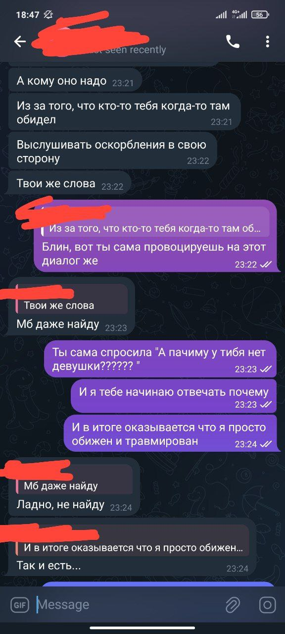 >>10551572 >Скорее всего хуестрадала по бывшему. Она с бывшем в одной квартире живет лол. А так ты прав да, вот какие простыни она мне писала. Видимо бывший все таки выебал и она успокоилась. Но я и не планировал с ней дел каких то иметь крутиться в рсп круге ещё и с бывшим нахер. забавно было общаться, а чо заблокировала так и не понял.