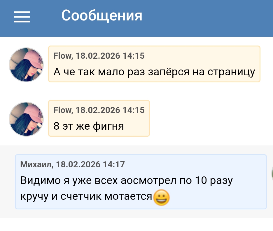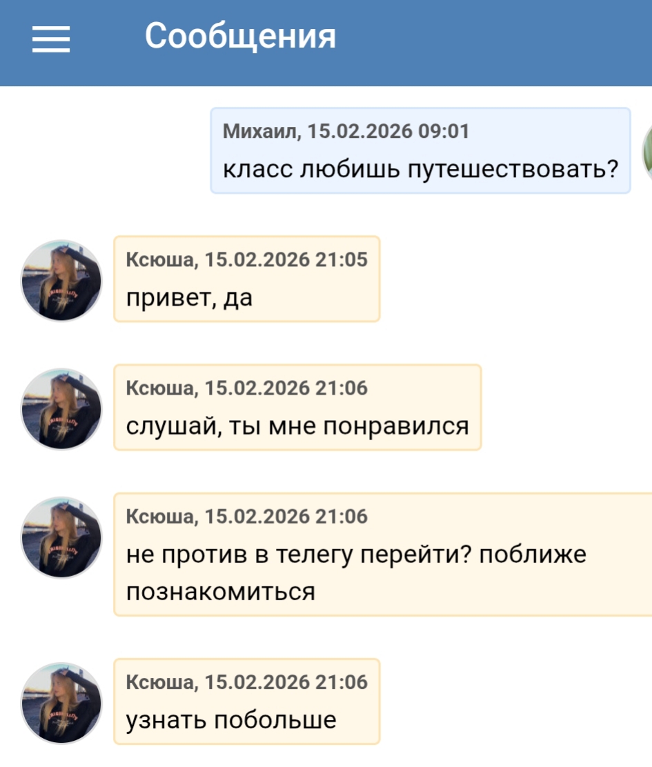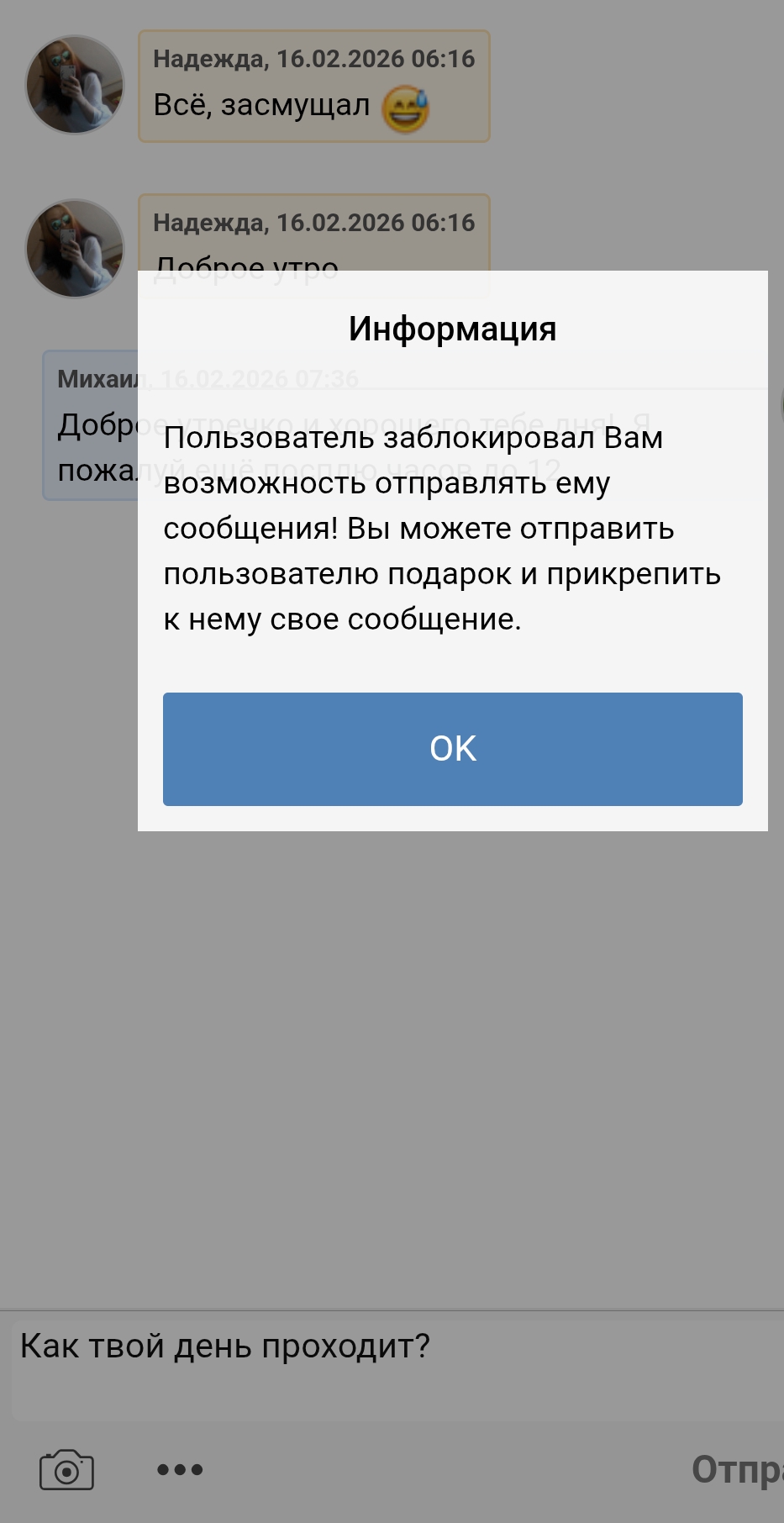 2 дня общался с тянкой. Кстати прям норм такая девка мне подстать общаться легко . Вчера пожелали друг другу спокойной ночи. С утра пишет мне доброе утро, ну я ответил и лег ещё поспать. Потом проснулся пишу, а всё, уже уже в блоке. Получается принцесса хотела общения в 6 утра, не развлек, либо нашла другого. Кстати не первый раз такая ситуация на пустом месте после приятного разговора, обычно после ночного сна, че то у них там переклинивает похоже. Ну и в целом непонятно зачем блокировать, я и так после того как пишу вопрос и не отвечают больше не тревожу.