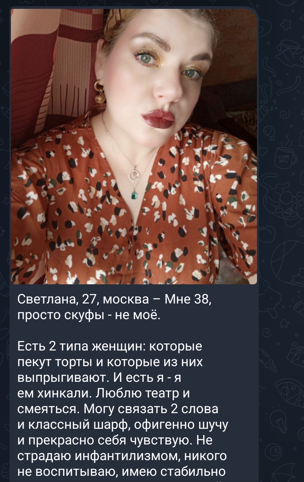 >>10578319 А нахуя нужна красивая с такой вот анкетой как у 38-летней? Если б там была 22-летняя зумерша модельной внешности, от этого что-то поменялось бы?
