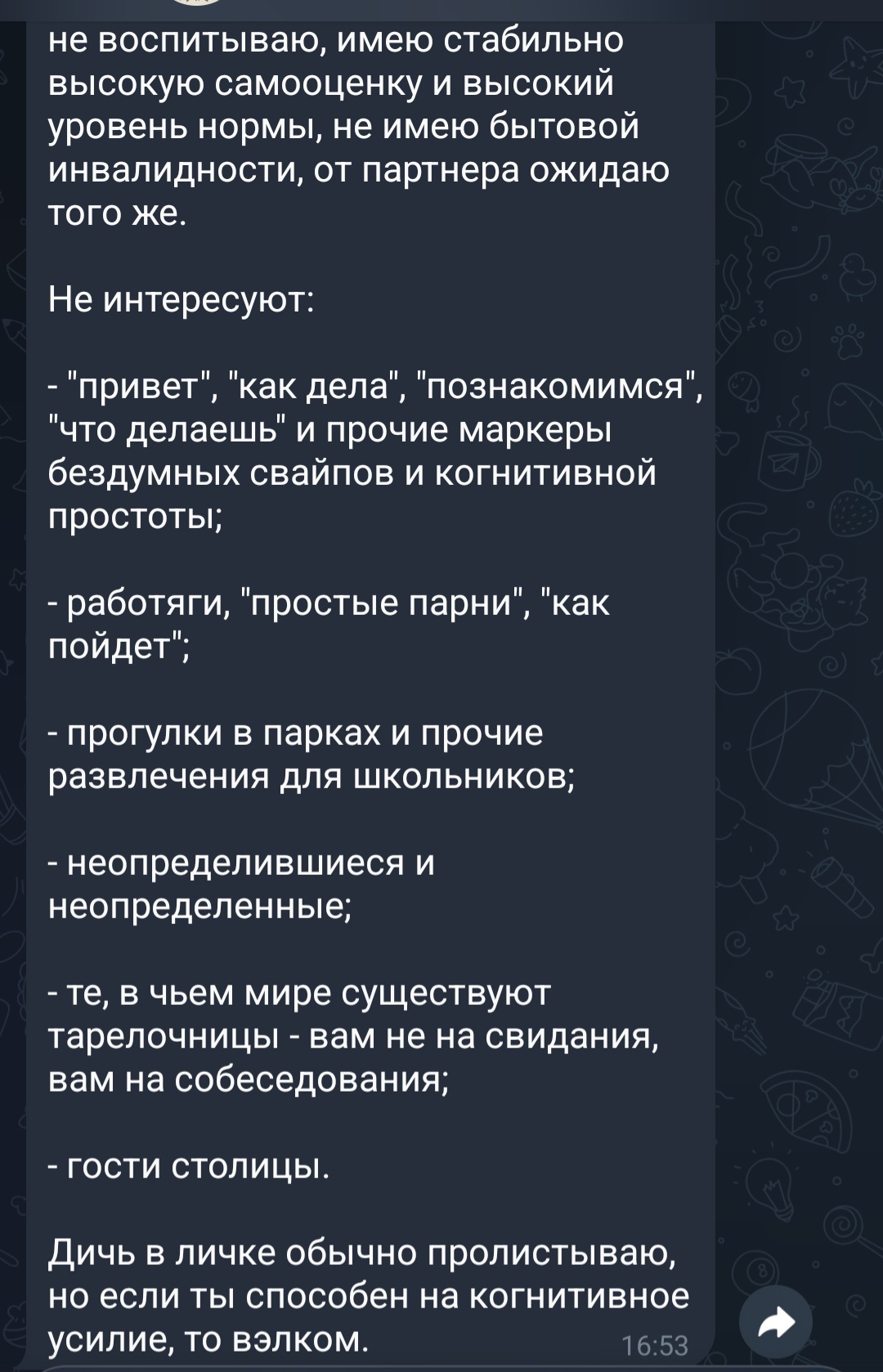 >>10577947 Ничего необычного. С гигиеной и здоровьем проблем вроде нет, девок стараюсь не заебывать. У меня безобидный фетишь на зубы и все что с этим связано. Наверное это фигурирует в пробивке, потому что некоторые девки кусаются, одна даже за язык грызанула. Не жлоб, но попрошаек терпеть не могу. Шиз, наркоман, много курю. Не скрываю этого, типа это же не создает проблем. Однажды я пообещал утопить диспетчера в ванной. И не только диспетчера. У меня очень специфическое чувство юмора. И еще часто доебываю своими душными разговорами. Призраки - единственные собеседники.