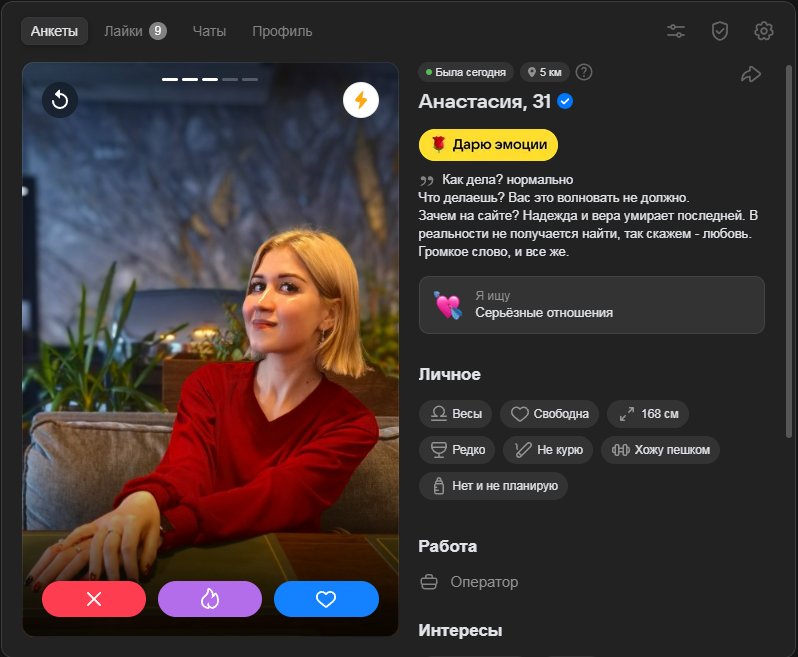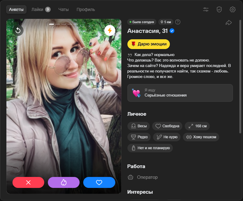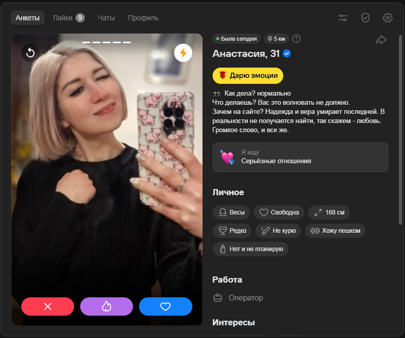 Фейков просто 99%, они даж не паряться над фото и описанием анкеты, отвечают через нейронку, фото тоже нейронка, пзтц. Причем сразу и не поймешь реальный человек или бот. Общение глохнет почти сразу, на встречу конечно же никто не ходит. Некоторые с премиумом сидят, видимо сама администрация их создает. Жалобу скидываю их даже не блочат. Во что СЗ скатились - инвалидки, мошенники, боты, проститутки. Действительно как выше анон писал биомусор всех мастей кто неликвид IRL.