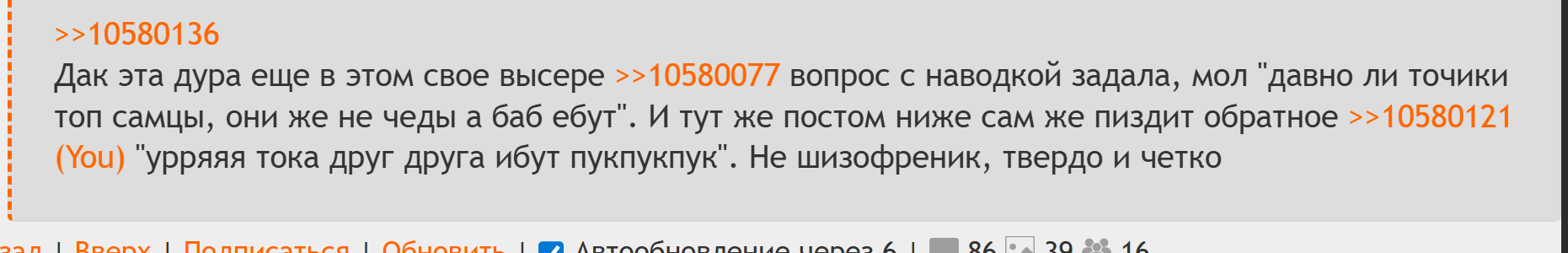 Поскольку здесь периодически пытаются устраивать филиал инцел-треда, к любой полученной ITT информации следует относиться с поправкой на местную аудиторию. Не забывайте репортить инцелошизу и просто шитпостинг (да, это работает).