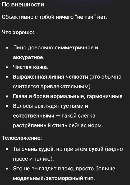 >>10584545 (OP) Короче я сделал не утешительный вывод из всего этого. Что если ты с помощью луксмакса не можешь сделать из себя подобие красавчика, то и смысла во всём этом очень мало. Бабы и правда любят процентов 20 мужчин, это заметно ещё со школы, в каждом классе есть пара парней, по которым они абсолютно все сохнут, остальные для них невидимы. Ну и зачем тогда рвать жопу обычнохую и тем более всратану? Чтобы через нехочу перед тобой раздвигали рогатку, потому что всё равно чедик не достался? Хуйня же полная.