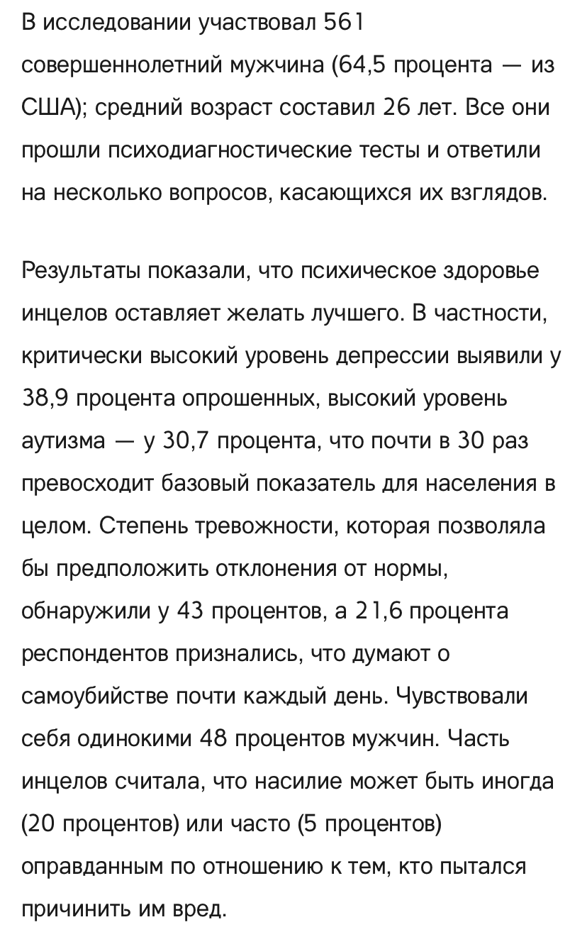 Интересно понаблюдать как обиженные люди обоих полов рационализируют свою ненависть и считают, что вот они то точно правы. Любопытно смотреть, какие именно аргументы приводятся. У фемцелов они гораздо более весомые, потому что женщин объективируют, соответственно к внешности у них явно выше запрос.