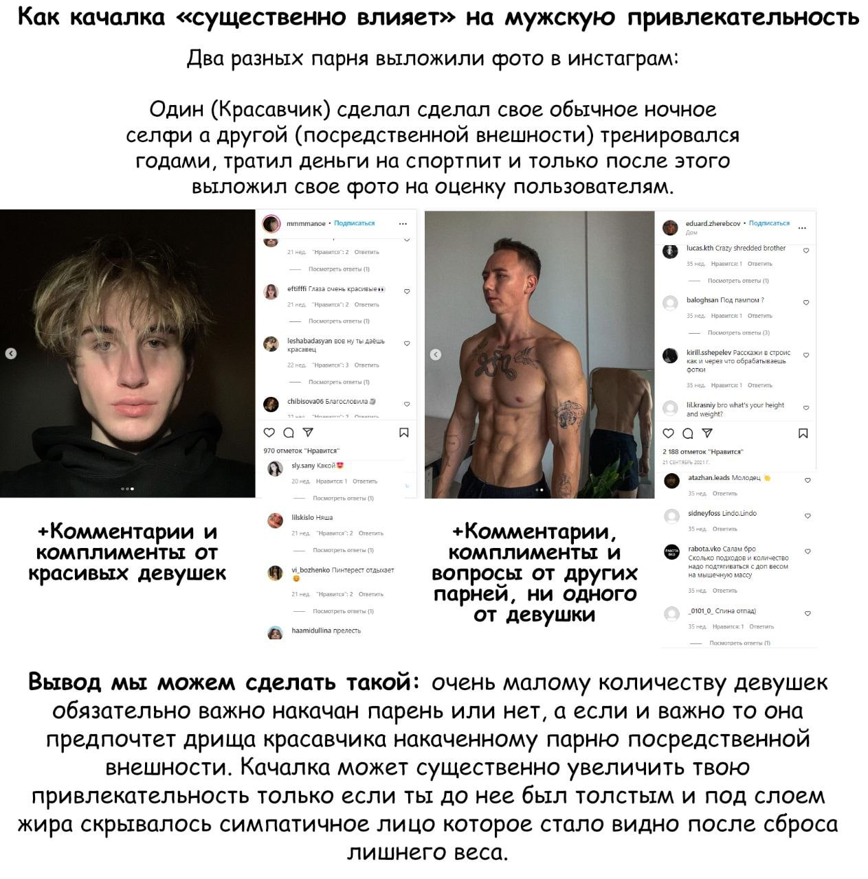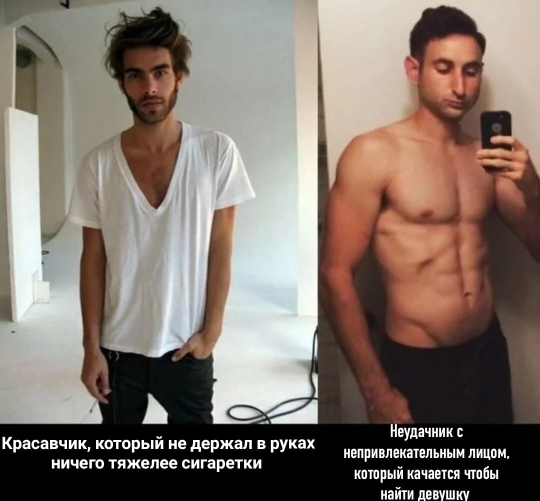 Пацаны, вот вы какую-то хуйню протираете. Обращаете внимание на мелочи. Вот к примеру какая разница какой хуй у мужчины. На хуй обращают внимание только пидары. Рост-лицо - опять же шняга беспонтовая. Для бабы главное чтобы мужчина был чуть красивее обезьяны. Зачем быть красивым, прихорашиваться. Вы что пидоры? Еще и сравниваете себя с другими мужчинами - ну точно пидары. Надо на баб смотреть! Во!!! Общайтесь с ними. Остальное приложится. Руки, ноги, голова есть? Есть! - покатит.