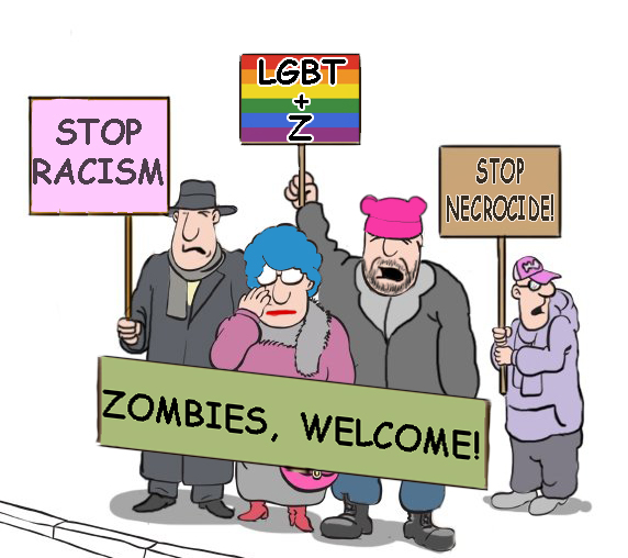 При первых же признаках массового заражения на улицы выкатывают тысячи фемок, куколдов, хипстеров и прочих проехавших, которые требуют оставить фашизм и прекратить некроцид. Либеральные сми сравнивают военных с нацистскими карателями, а карантинные зоны - с концлагерями. Кто-то даже осознано заражает себя в знак протеста. В конце концов власти уступают давлению общественности и пытаются остановить зомби-апокалипсис "мягкими" способами. Введён комендантский час, на улицах запрещено появляться по одному, полиция для сдерживания заражённых использует сети, транквилизаторы и водоёмы, а сми убеждают граждан, что зомби не опасны и их количество сильно преувеличено. Силы самообороны приравнены к террористическим группировкам, несогласных арестовывают, за убийство зомби дают больше сроки, чем за убийство живого. Случаи нападения зомби на живых наоборот же замалчиваются. В конце концов, потеряв 1/2 населения, правительству удаётся создать вакцину. Вакцина делает зомби менее агрессивными и возвращает им подобие рассудка - несмотря на то, что они остаются ходячими трупами, они могут частично понимать человеческую речь и выполнять простейшие действия. Слова типа "дохляк", "труп", "зомби", "мертвяк" признаются националистическими. Для обозначения зомби используется термины "некропозитивный" и "граждане с ограниченной функцией жизнедеятельности". Некропозитивные, несмотря на почти полную недееспособность, активно интегрируются в общество. Были даже попытки отдавать на воспитание детей в некропозитивные семьи. Но их съели. Женские журналы наперебой печатают статьи о плюс брака с некропозитивными мужчинами и способах зачать ребёнка от них, а на экран выходят блокбастеры с некропозитивными актёрами в главных ролях. На парламентских выборах побеждает партия, представляющая интересы граждан с ограниченной функцией жизнедеятельности.