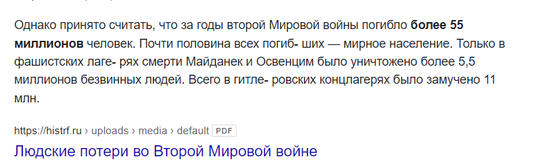 >>234983 >>234989 Не он назвал, а я. И сейчас тебе ещё разок щёлкну по ебалу хуем. Для 2й мировой эти потери катастрофичны, из расчёта участвовавшего в ней населения. Но это количество даже близко не подходит под все 7млрд. Если подходить к пропорциям то во 2й мировой, еслиб воевал ковид - погибло бы 25млн человек, максимум. Опять же с поправкой что 100% населения взяло бы винтовки в руки и полезли в окопы! Даже во 2й мировой такой хуйни не было, а значит реально количество при участии коровы как стороны конфликта было бы 1-2млн смертей, а то и меньше. Если подходить к жертвам в одной стране - это много, но вот в размазанных цифрах на всё население планеты... от упавшего на голову кирпича или его аналогов примерно столько же погибает. Смекаешь?