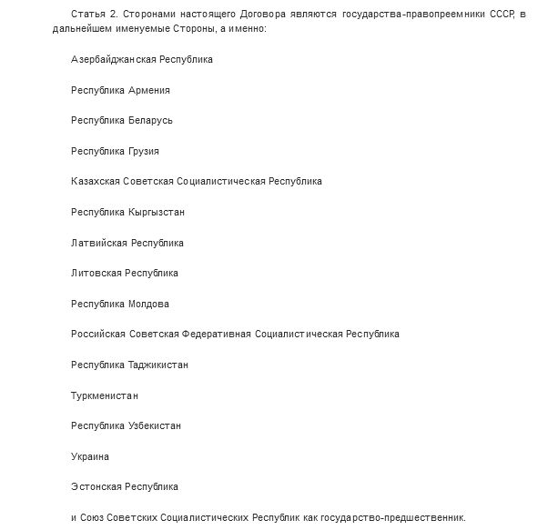 Статья 2. Сторонами настоящего Договора являются государства-правопреемники СССР, в дальнейшем именуемые Стороны, а именно: Азербайджанская Республика Республика Армения Республика Беларусь Республика Грузия Казахская Советская Социалистическая Республика Республика Кыргызстан Латвийская Республика Литовская Республика Республика Молдова Российская Советская Федеративная Социалистическая Республика Республика Таджикистан Туркменистан Республика Узбекистан Украина Эстонская Республика