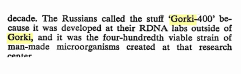 >... что куда интереснее, в оригинальном тексте «Глаз тьмы» вирус объявлен детищем советских военных и назван вовсе не «Ухань-400», а «Горки-400». Переименовали его и сменили «прописку» только в издании 2008 года, выпущенном американским издательством Berkley и сейчас продающемся на Amazon.