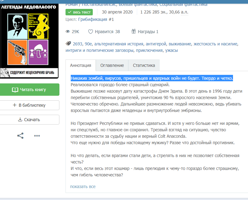 >>203434 >>203511 Уговорил, разрешаю скачивание книги для подписчиков. Так что можешь зарегаться, подписаться на автора и навернуть книгца в читалке. Рега занимает меньше минуты.