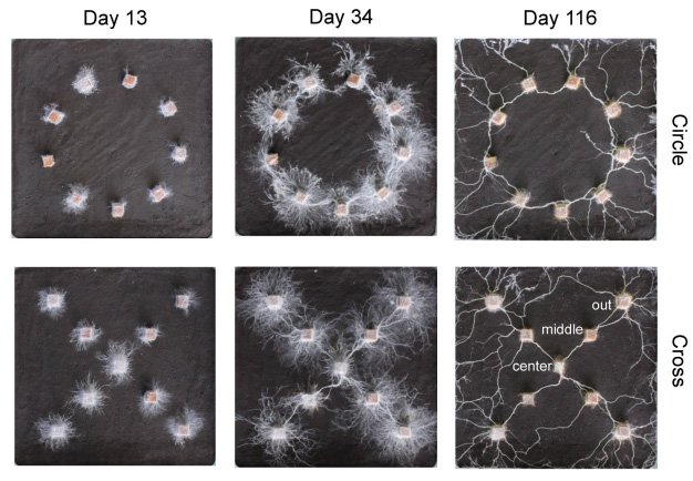 Японские исследователи в Университете Тохоку поделились удивительным открытием: гриб Phanerochaete velutina распознает формы и передает данные о своем окружении через мицелиальную сеть. В рамках экспериментов ученые разместили бруски из дерева различных форм и позволили мицелию расти на таковых. >пикрил Оказалось, что гриб принимает решения, «опираясь» на расположение блоков. Это свидетельствует об элементарном уровне интеллекта. Например, при размещении блоков крест-накрест мицелий распознавал внешние элементы и передавал информацию об их локации. В случае кругового размещения блоков гриб не проникал в центр, осознавая отсутствие блоков.