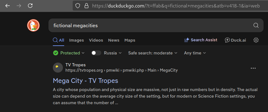 Если список произведений нашёл с достаточно широким охватом (а не как в "Category:Megacities in fiction" на Википедии), перебирать примеры придётся не особо долго, потому что это произведение будет довольно близко к началу списка просто в силу упорядочения по алфавиту. В реквестач-треде оно в посте, которому сейчас месяц с небольшим.