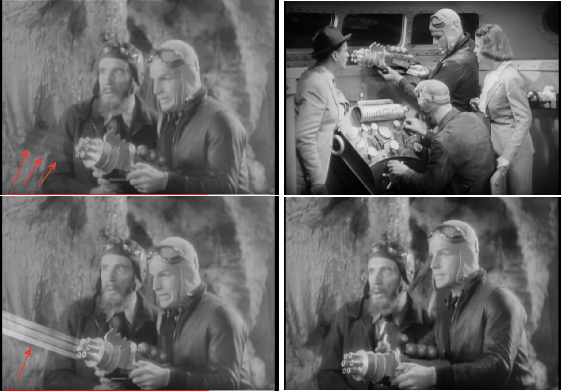 Во-первых, у Гамильтона появляется привычный уже нам звездолет в форме некоего продолговатого веретенообразного или рыбообразного тела. Корабль имеет сверху что-то вроде боевой рубки, "внизу" же расположен двигатель (в тексте обычно генератор), производящий движение по средствам генерации неких эфирных колебаний. Первая модель звездолета (1927) летала со скоростью света, но уже в 1929г корабли развивают тысячи световых скоростей в минуту, однако никаких релятивистских эффектов не наблюдается. Вообще Гамильтон описывает свои корабли крайне скупо, в отличии от других, поэтому каждый волен домысливать их в силу своего воображения. И наверное по этому же Гамильтон и сегодня выглядит "современнее" своих современников. На кораблях есть пост управления, оборудованный неким дросселем для регулировки частоты генераторов, рычагами, свитчами и циферблатами. Также на первых моделях были голографические экраны, но потом их зачем то убрали. Зато появился штурвал и проекционный экран из полированного металла, на который неведомо как проецируется тактическая обстановка. Таких экранов вы видели мильён в кинофантастике. В 1929 же звездолеты обрели цветные силовые лучи, но принцип их работы неизвестен. Любопытно, что бойцы межзвездного патруля не имели личного оружия, в то время как злобные алиены с самого начала носили в своих лапцах разные ручные вундервафли! В 1931г Эдмонд одел своих астронавтов в классический скафандр со сферическим стеклянным шлемом, и выпустил их в открытый космос, где они начали ебашить друг друга железными дрынами, тогда же у алиенов появился Световой Меч!
