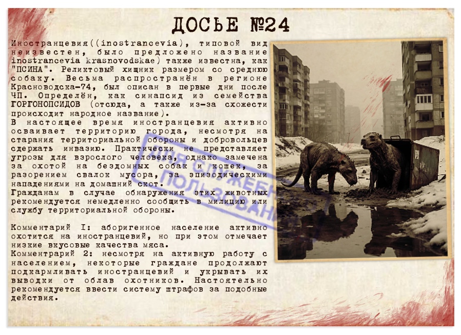 Подкрепление. Боевые, мать вашу, роботы, во время первой стычки принятые за присланное из Норильска подкрепление. Название прижилось. Примитивные, обычно двуногие, крупные дроны. Вооружены простым стрелковым оружием, но калибр нетипичен ни для одной из стран. Несмотря на то, что серийные номера на кириллице, аббревиатуры отсылают к каким-то определённо не существующим в нашей реальности городам и округам. На территорию города не заходят, но атакуют людей, пытающихся проникнуть в лес. Встречаются крайне редко, за всю историю наблюдений не более десятка случаев.