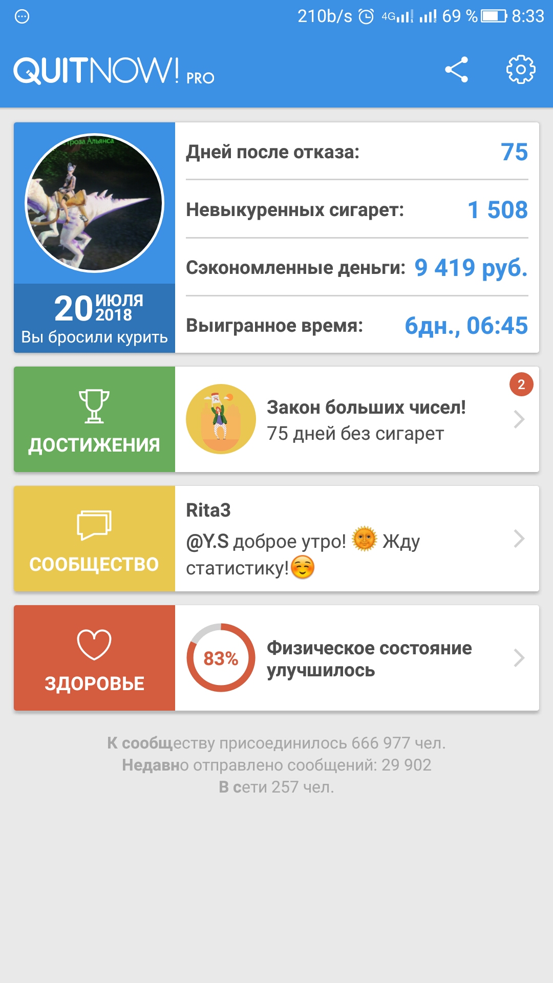Не курю с 18 ноября 2018 года, мимо проходил и решил вот заглянуть в этот тредик. Первый месяц заходил сюда каждый день, наверное. Сложно было, но вот уже больше года как я не курю. Счастливый и здоровый. Сигареты снились где-то с пол года, минимальная тяга была около года, но это так, не существенно. Просто мысли, что может сигареты стали лучше и стоит попробовать одну. Такое выгоняется из головы за секунду. Сильно хотелось покурить, уже точно не помню, но в районе одного-двух месяцев. Срабатывали разные тригеры (выход из дома/прием пищи/ожидание транспорта/езда на машине и т.д. плюс стресс) приходилось переучивать свой мозг по другому воспринимать эти ситуации. Сейчас я уже не думаю, что закурю, мне это не интересно. Каждый день вижусь с курящими людьми, но самому курить не хочется.