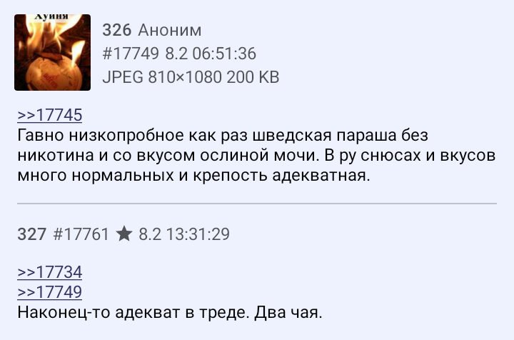 фига се говноеды оккупировали трэд. одни покупают всякое говно сделанное хз как. другой дурачок намеревается снюс делать на продажу лол. вот так через жопу всё в рашке у нас и делается, не было бы запрета - щас бы на прилавках были генералы тандеры и тд. а всякий шлак сделанный в подвале не смог бы конкурировать. ща есть Лифт за 350р который раньше назывался Эпок и по 500р стоил - пожалуйста, вот он шведский продукт за смешные деньги. но его брать говноеды не хотят - ведь ОН НЕ ЖМЫХАЕТ ЕПТА т.к. дёсны уже спалили всякой фигнёй, хотя раньше по 500р за банку разлетался.