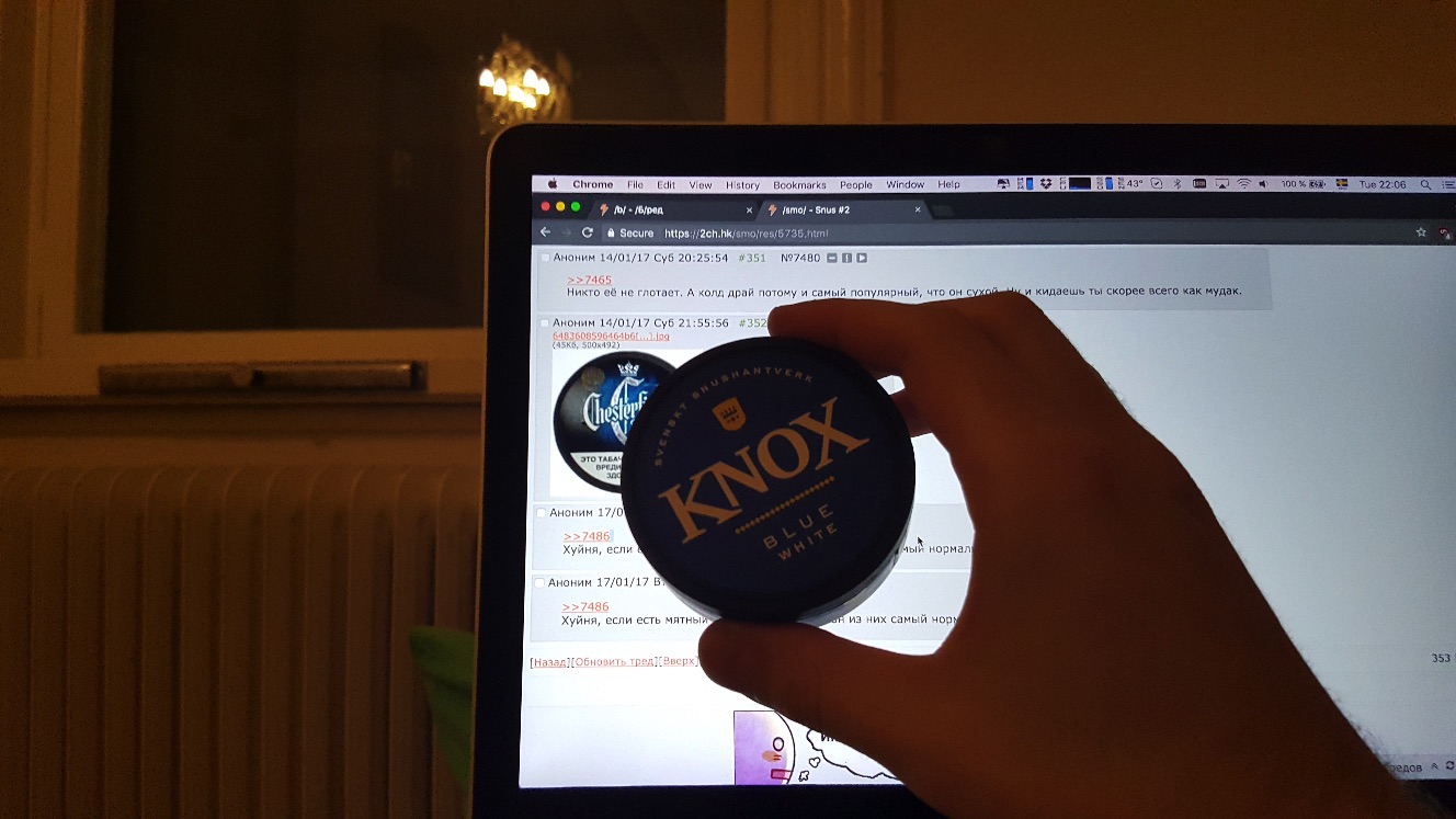 >>6941 Новосиб. Чекаю 5-6 табачек на появление ништяков, иногда выбираюсь в европку, в чехии можно купить абсолютно весь снюс, огромнейший выбор, только дороговато, в переводе пачка рублей 500 стоит. У меня в городе раньше была только полная хуйня Generals, Parlament, Byron, Thunder, Epok только слабый, вот эта поебота. Поэтому единственное что можно было вкидывать это обычный Колд Драй. Узнал тут про существование красной Сибири, чекнул все точки в городе, сказали что такой нигде нет, но нашёл коричневую. Это было 2 месяца назад. После коричневой Сибири (та же, что и красная, только блять влажная) взял на затест Эпок Ультра Стронг, потом вообще завязал на 2 месяца. Сейчас вышел из завязки, скидал пачку эпока ультра, пачку обычного колд драя и пачку колд драя в железной банке, пачку Якобсона. В пн-вт буду тестить красную Сибирь из Швеции и что-нибудь из Европы.