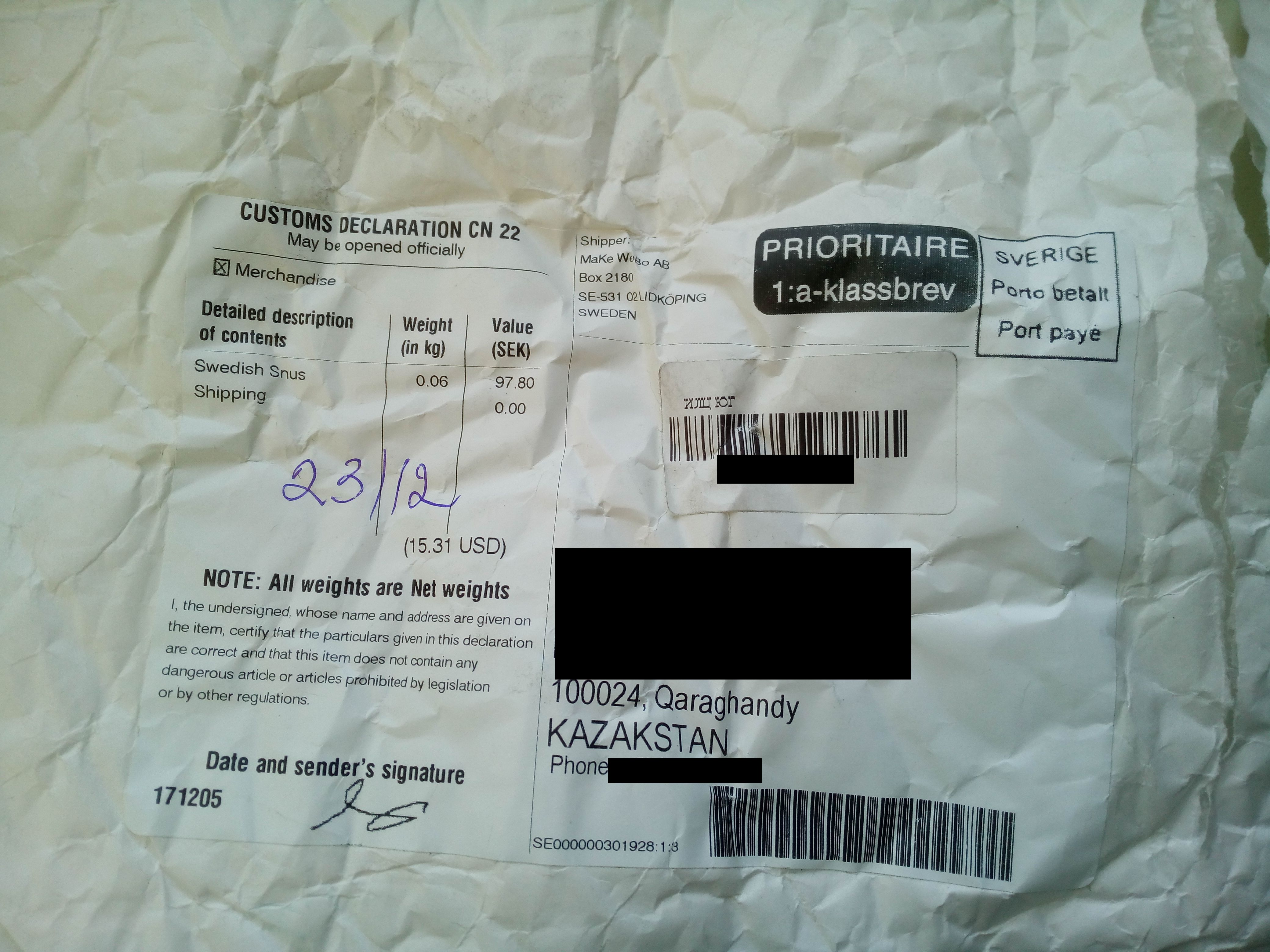 Заказал 4.12 с сайта snusexpress.com 3 шайбы, пришли 23 числа(19 дней) в Караганду (кз), как и говорили в пределах 15-20 дней. Буду там заказывать ещё. Тем кто тоже из кз - советую брать там чем у местных барыг, получается почти в 2 раза дешевле. Тем кто из рашки - облом, на сайте нет даже этой страны для отправки, скорей всего из-за всей это фигни с запретом.