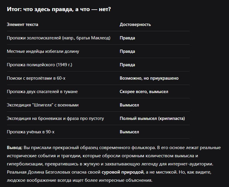 Вкратце: в самой жопе Канады есть долина, где уже под 150 лет (это то что задокументированно) иногда пропадают люди, а находят их с отчекрыженной башкой, если находят. Башку не находят. Долина в адовых ебенях не популярных даже у туристов, туда хер доберешься (самолет или лодка только, плюс надо получать разрешение на визит этого национального парка), ее даже пытались исследовать - с предсказуемой потерей головы. Поискал "разоблачения" - ничего не находится кроме нелепых манипуляций с выкидыванием неудобных фактов "давайте остановимся на исчезновениях в начале 20 века и сделаем вид что это бандиты".