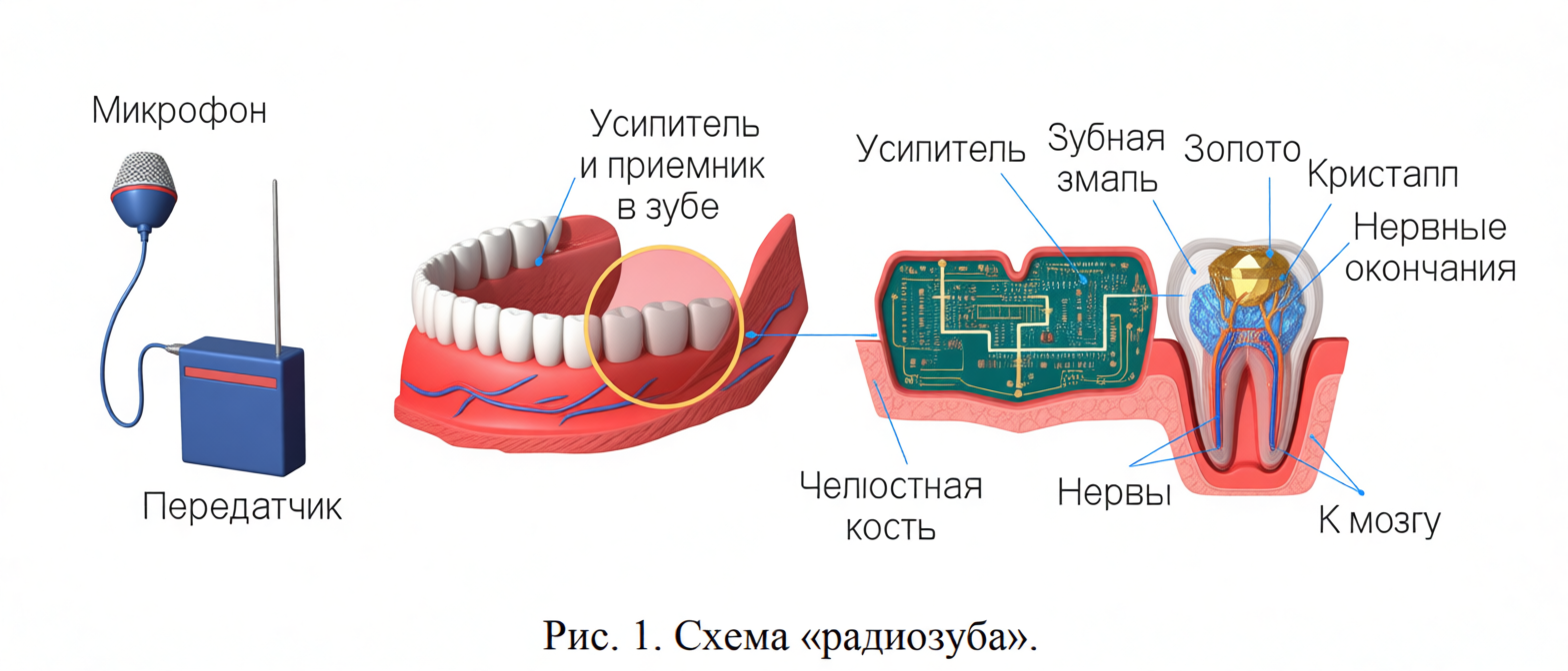 Но доктор Пухарик пошёл дальше. Доктор Пухарик увидел в этом феномене не просто случайность — а прорыв. Вместе с доктором Лоуренсом и инженерами доктор Пухарик создал «РАДИОЗУБ» — первый в мире слуховой имплант, встроенный прямо в зубную пломбу. Сигнал с миниатюрного передатчика на запястье улавливался полупроводниковым слоем в зубе, возбуждал нервные окончания — и звук возвращался в мозг.