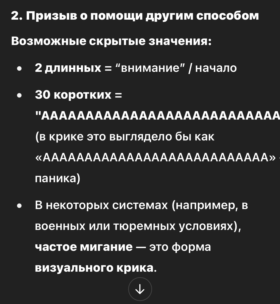 Решил расшифровать с помощью чат гпт, но по видео он ничего не понял, пришлось самому считать эти сигналы и писать ему - картина выходит странной, это точно не морзянка, ибо выходит бред