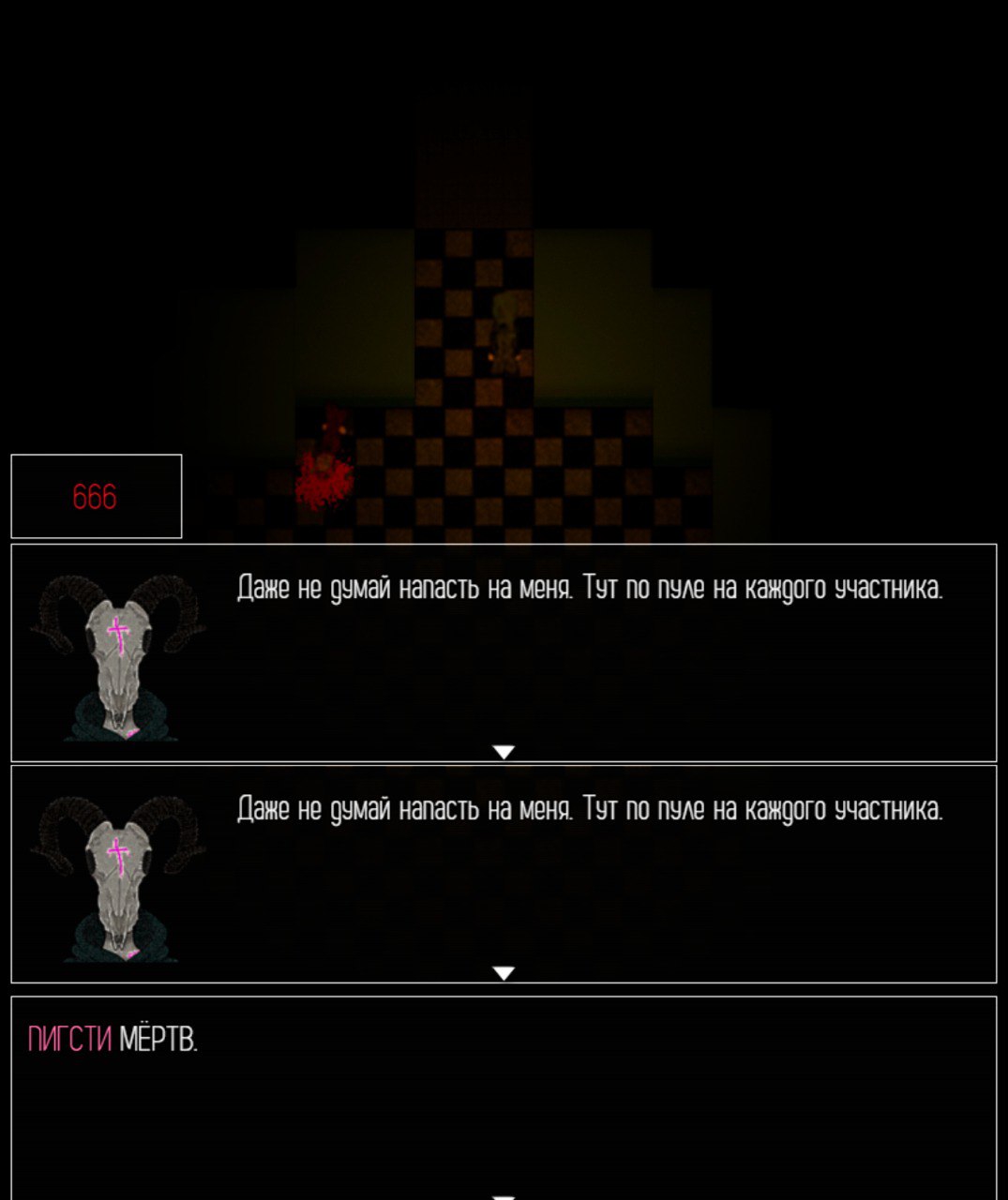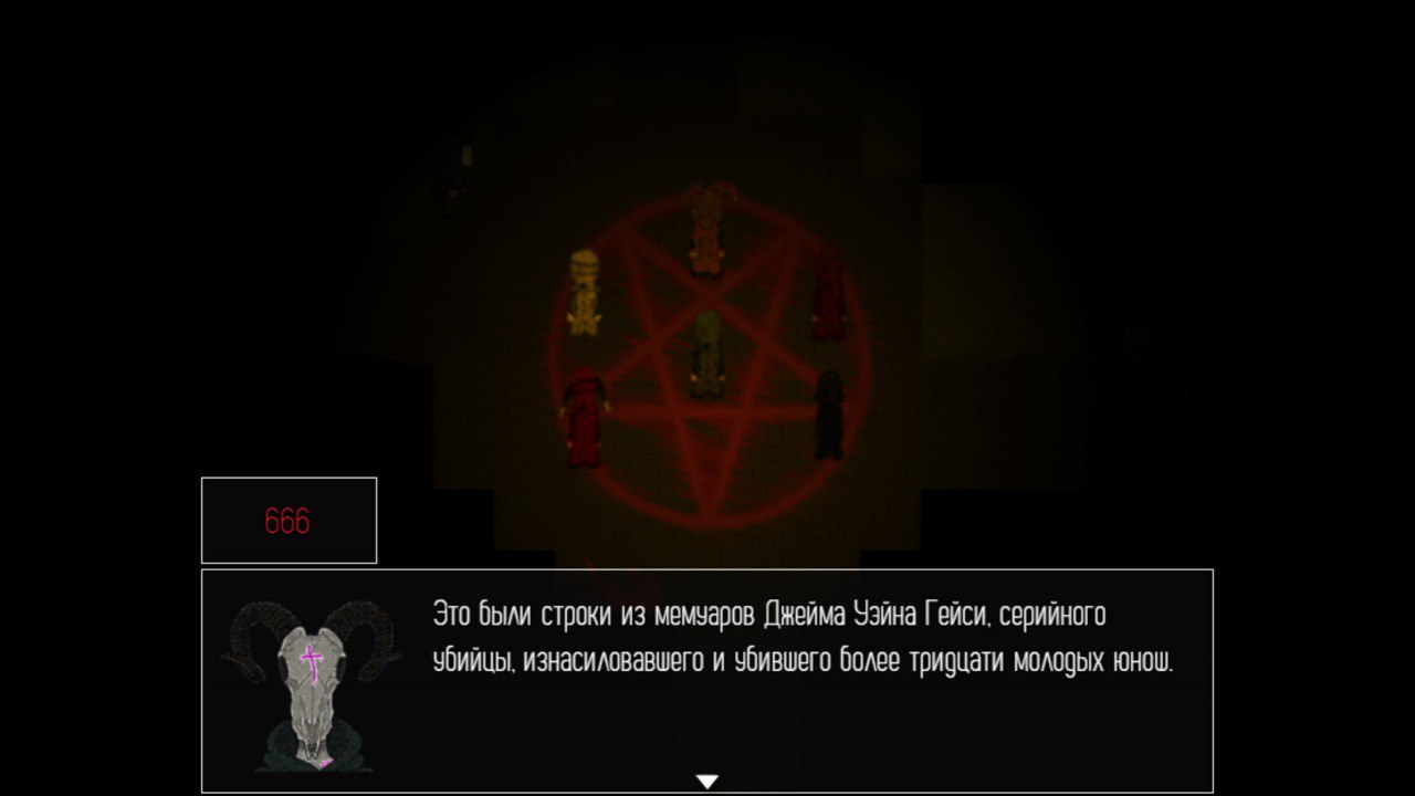 Скажу так, попытка создать криппипасту неплохая, даже игру сделал, летс плей есть (на английском, вау), видосы игры, скриншоты, даже ссылка, красота. Создание чего то своего всегда похвально, а вещи окутанные мистическим и таинственным флером так тот что доктор прописал. Но ОП, если ты правда автор этой игры то прими небольшую ложечку критики. Я могу описать игру одним словом - Дурновкусие. Причем во всем, от истории до артдизайна. Поверхностная история сатанюг с шок-контентом ради шок контента, с легкой попыткой сделать игру якобы глубже чем она есть. Я в нее не играл, не люблю качать говно на комп, вирусов мне не нужно, но из того что я увидел: Ноль расскрытия персов, история никакая откровенно, ноль глубины, ноль фантазии, какие то бредни школьника, не более, не история сатанистов, а попытка школьника сделать жЁсткую историю типа сатанистаффф. Непонятное повествование в попытке создать таинственность не работает, ничего не понятно и оно никак не цепляет и не вызывает желание разобраться в этом (А ЭТО САМОЕ СТРАШНОЕ ДЛЯ ТАКИХ ИГР, КОГДА ТЫ ПРОСТО НЕ ХОЧЕШЬ В ЭТО ИГРАТЬ). Просто попытка сделать мясо матюки убийства и голые сиськи. Одним словом - старайся лучше. Рано или поздно получиться что-то прекрасное. Сначала надеялся что будет что-то похожее на Close you eyes или My hole is a mouth of dirt, но в итоге просто срань какая то. Анон, играй в хорошие игры на РПГ мейкере, их много, правда, там есть чему поучиться. Та же Иб без кровяки и жестяка пугает сильнее чем такая дурная поделка. Потому что есть полет фантазии, есть стиль, есть старание, а тут...